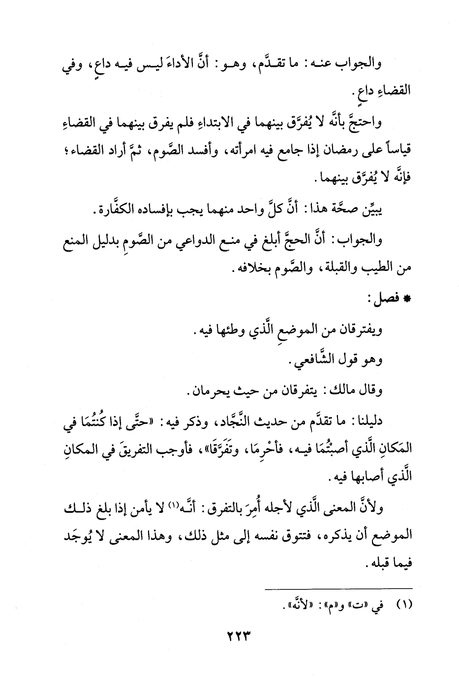 ولأن المعنى الذي لأجله أُمر بالتفرق: أنه لا يأمن إذا بلغ ذلك الموضع أن يذكره، فتتوق نفسه إلى مثل ذلك، وهذا المعنى لا يُوجد فيما قبله.