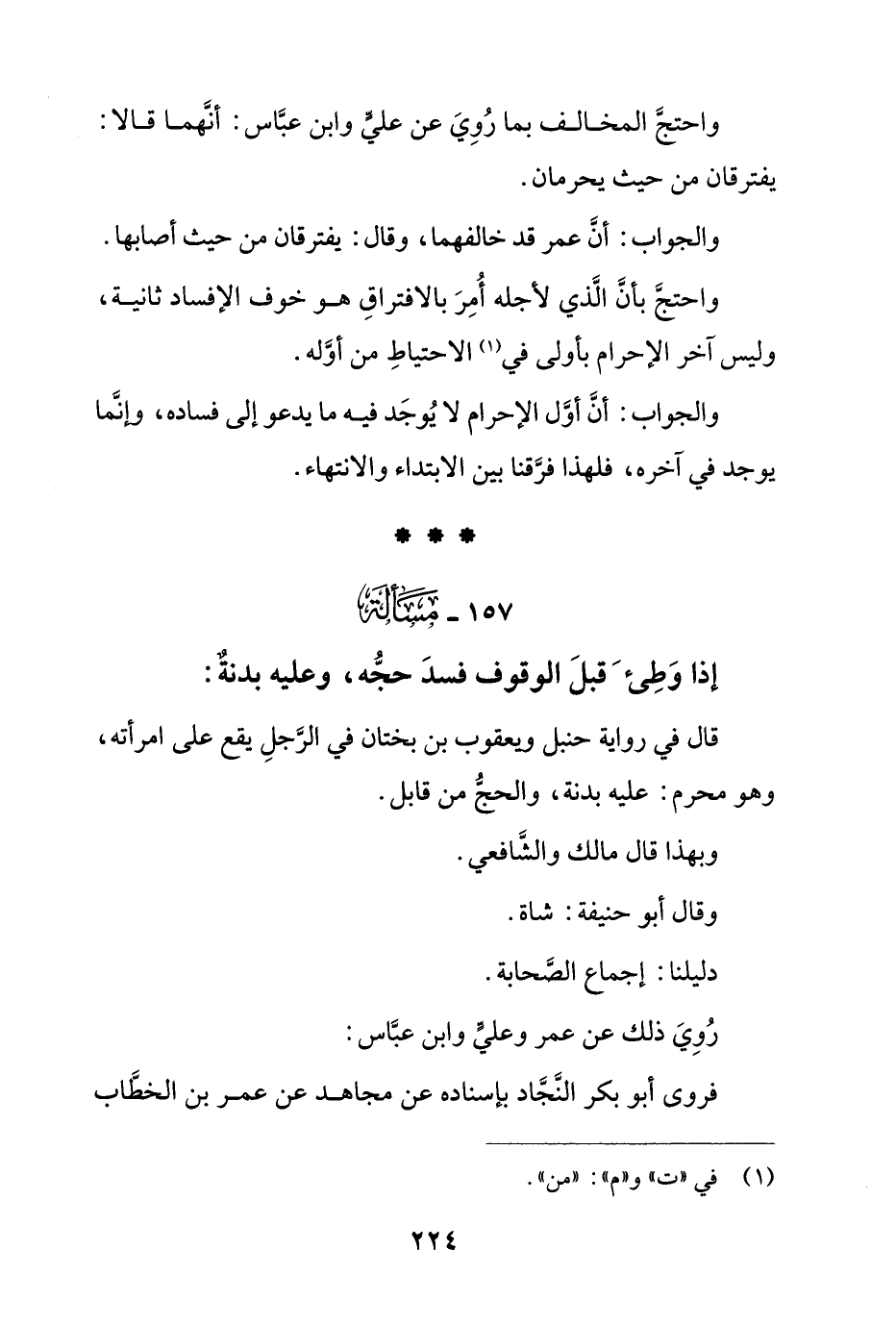 واحتج بأن الذي لأجله أُمر بالافتراث هو خوف الإفساد ثانية، وليس آخر الإحرام بأولى في الاحتياط من أوله.
