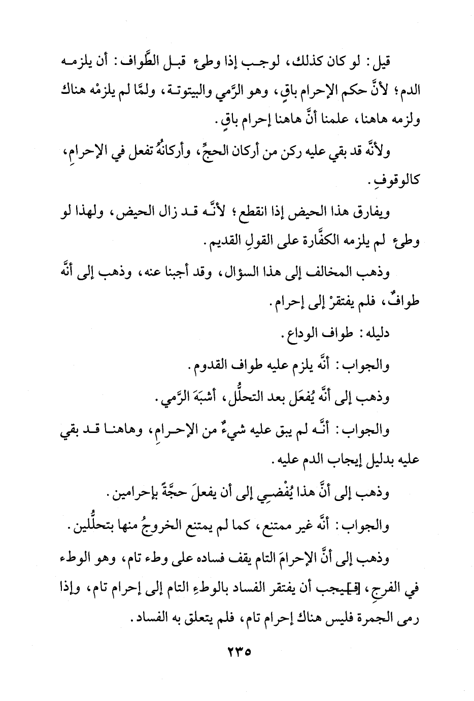 وذهب إلى أن الإحرام التام يقف فساده على وطء تام، وهو الوطء في الفرج، فيجب أن يفتقب الفساد بالوطء التام إلى إحرام تام، وإذا رمى الجمرة فليس هناك إحرام تام، فلم يتعلق به الفساد.