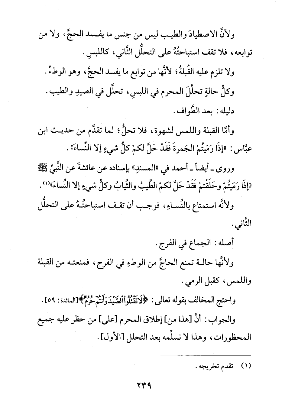 ولأن الاصطياد والطيب ليس من جنس ما يفسد الحج، ولا من توابعه، فلا تقف استباحته على التحلل الثاني، كاللبس.