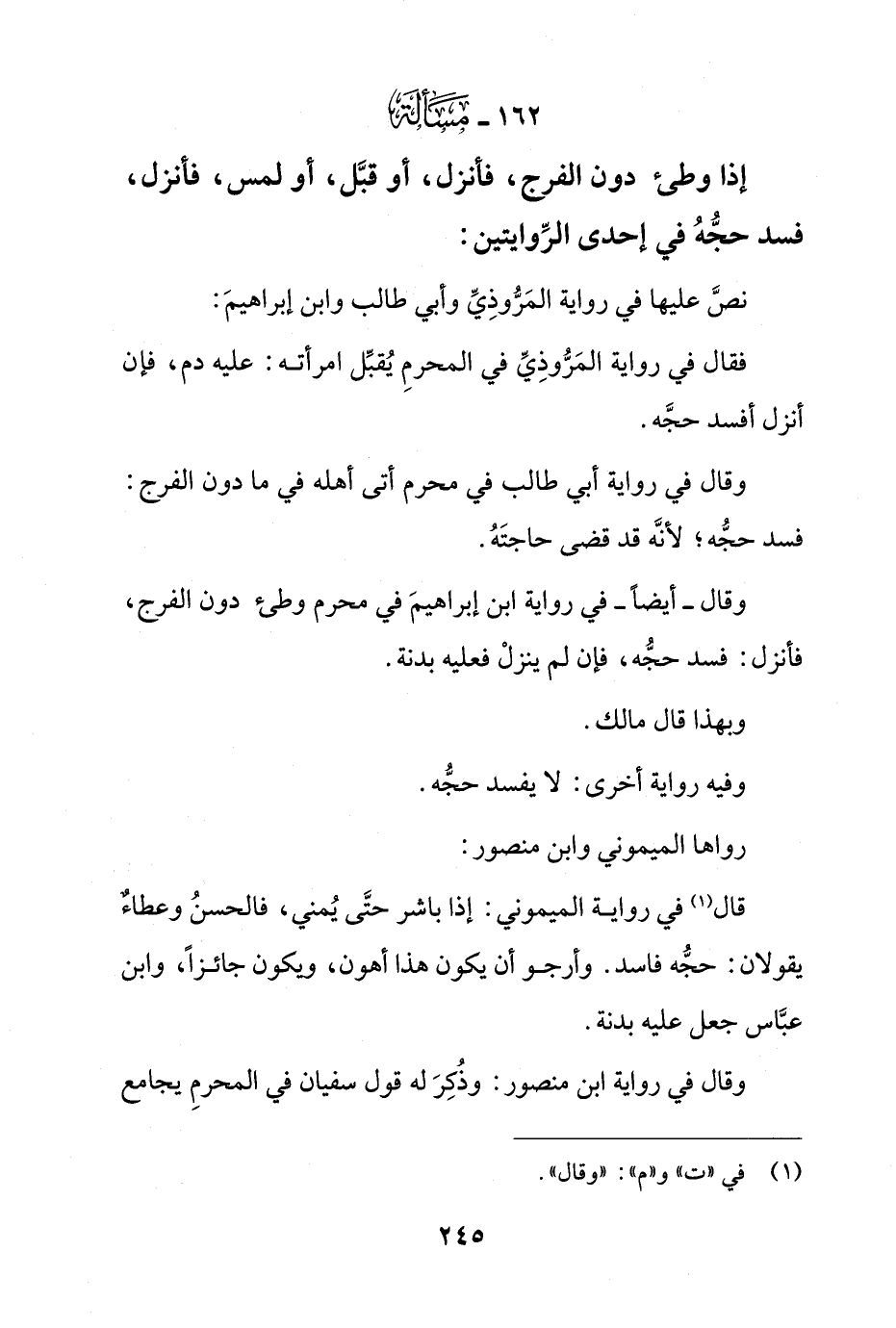 وقال -أيضاً- في رواية ابن إبراهيم في محرم وطئ دون الفرج، فأنزل: فسد حجه، فإن لم ينزل فعليه بدنة.