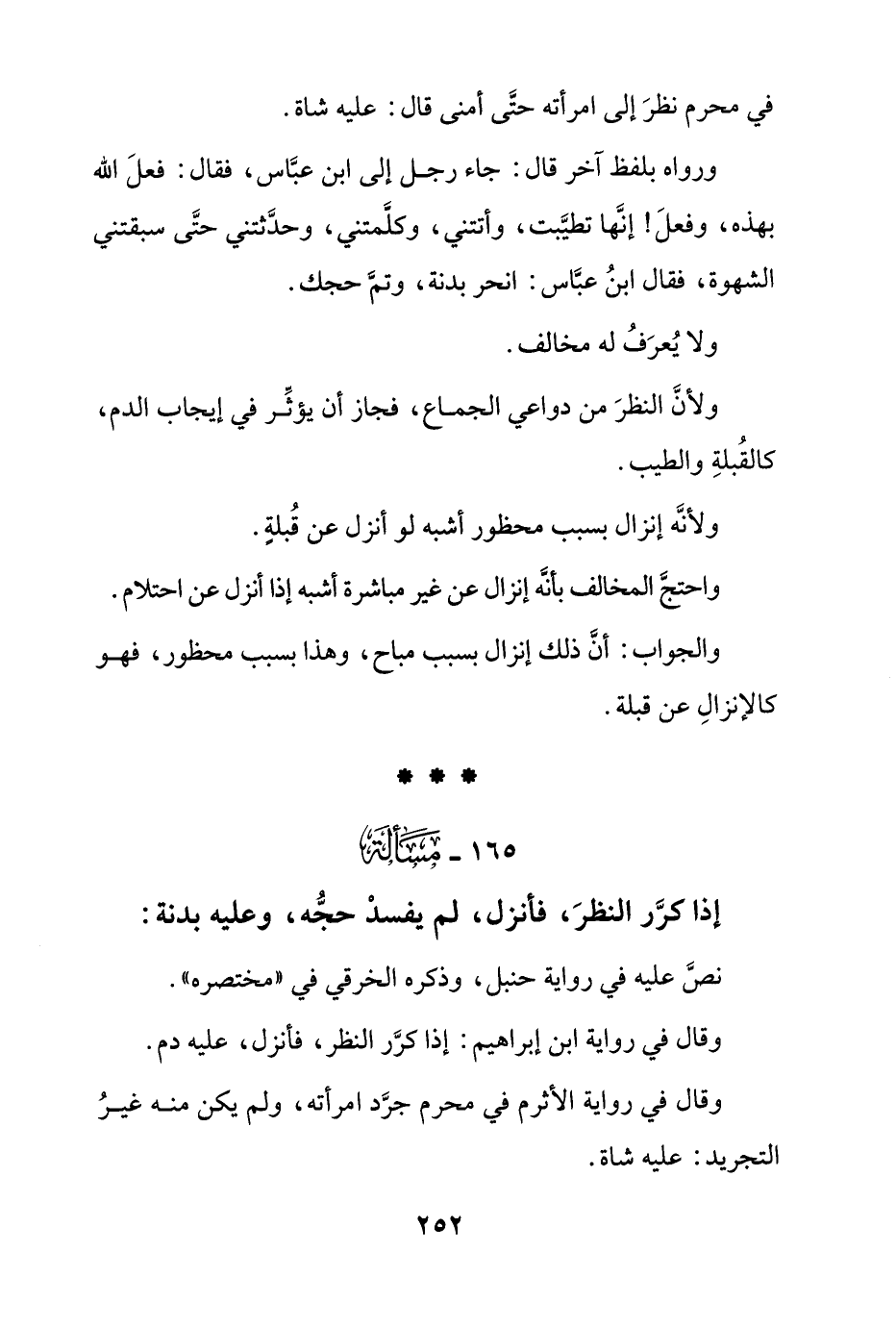 ورواه بلفظ آخر قال: جاء رجل إلى ابن عباس، فقال: فعل الله بهذه، وفعل! إنها تطيبت، وأتتني، وكلمتني، وحدثتني حتى سبقتني الشهوة، فقال ابن عباس: انحر بدنة، وتم حجك.