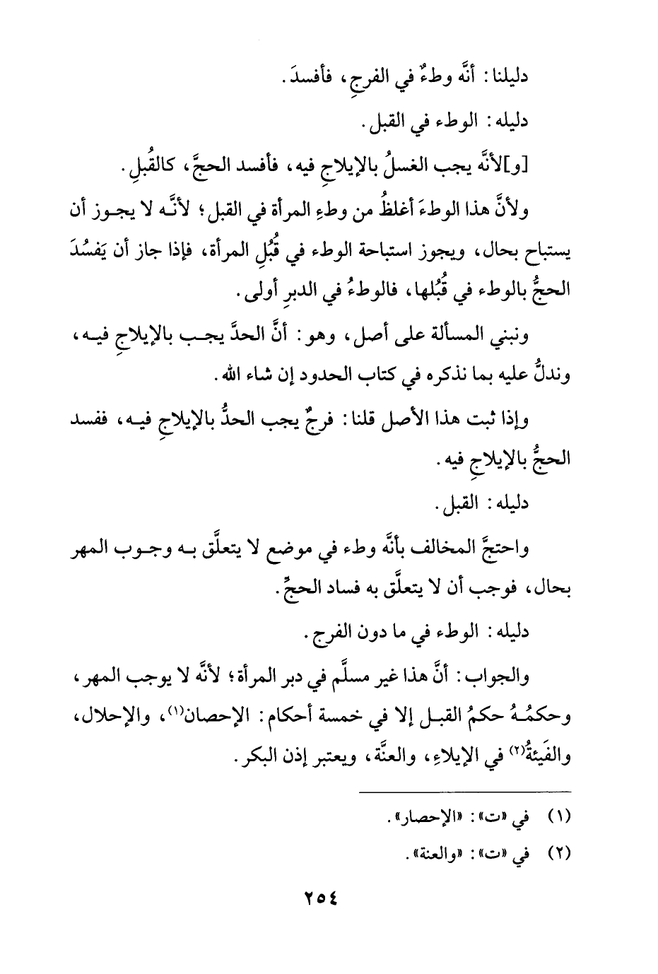 والجواب: أن هذا غير مسلم في دبر المرأة؛ لأن لا يوجب المهر، وحُكمه حكم القبل إلا في خمسة أحكام: الإحصان، والإحلال، والفيئة في الإيلاء، والعنة، ويعتبر إذن البكر.