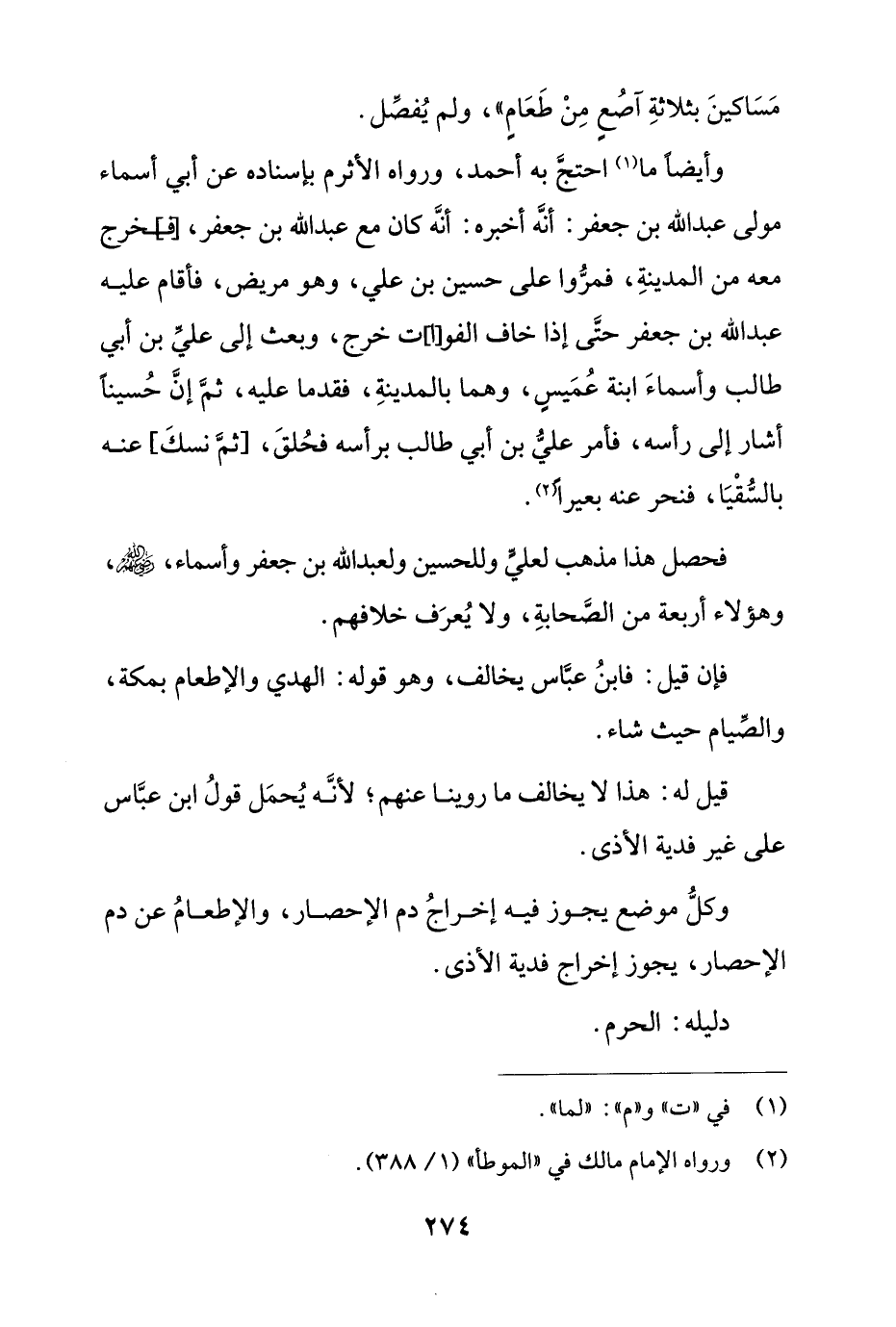 وأيضاً ما احتج به أحمد، ورواه الأثرم بإسناده عن أبي أسماء مولى عبد الله بن جعفر: أنه أخبره: أنه كان مع عبد الله بن جعفر، فخرج معه من المدينة، فمروا على حسين بن علي، وهو مريض، فأقام عليه عبد الله بن جفر حتى إذا خاف الفوات خرج، وبعث إلى علي بن أبي طالب وأسماء ابنة عُميس، وهما بالمدينة، فقدما عليه، ثم إن حُسيناً أشار إلى رأسه، فأمر علي بن أبي طالب برأسه فحُلق، [ثم نسك] عنه بالسُّقيا، فنحر عنه بعيراً.