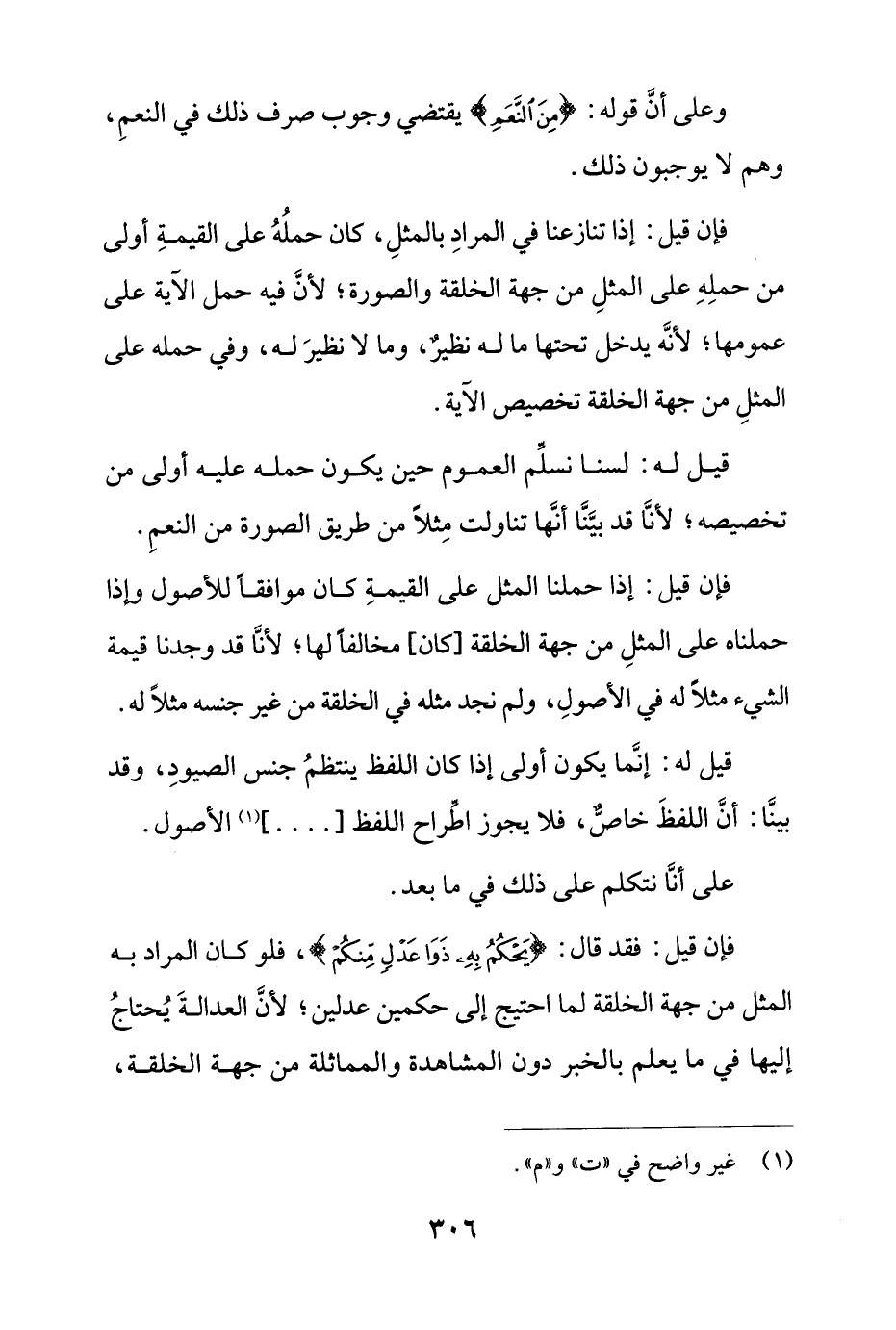 فإن قيل: فقد قال: {يَحْكُمُ بِهِ ذَوَا عَدْلٍ مِّنكُمْ}، فلو كان المراد به المثل من جهة الخلقة لما احتيج إلى حكمين عدلين؛ لأن العدالة يحتاج إليها في ما يعلم بالخبر دون المشاهدة والمماثلة من جهة الخلقة،