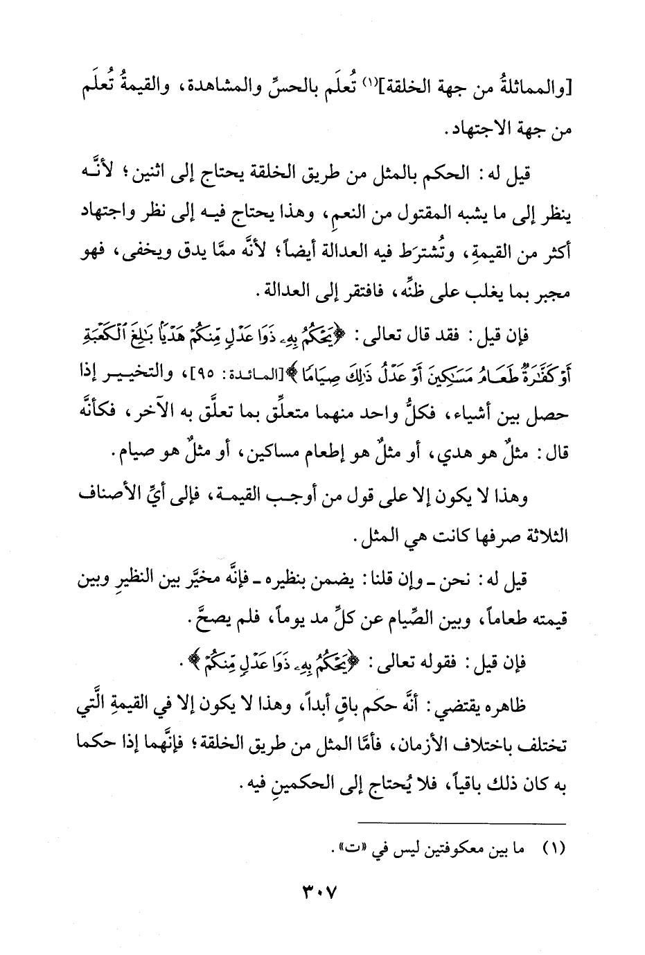 [والمماثلة من جهة الخلقة] تعلم بالحس والمشاهدة، والقيمة تعلم من جهة الاجتهاد.