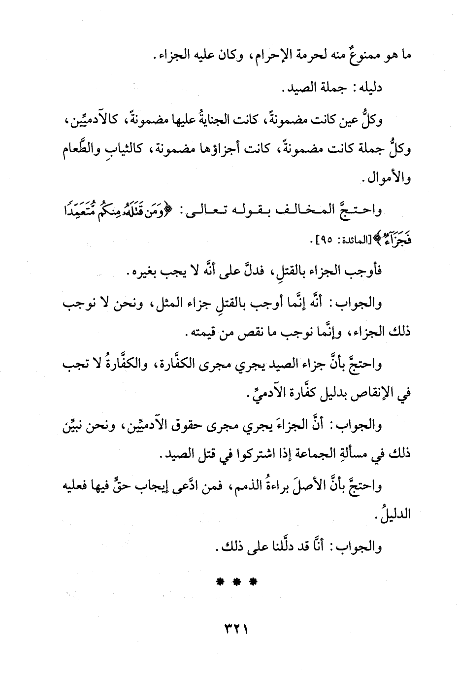 والجواب: أنه إنما أوجب بالقتل جزاء المثل، ونحن لا نوجب ذلك الجزاء، وإنما نوجب ما نقص من قيمته.