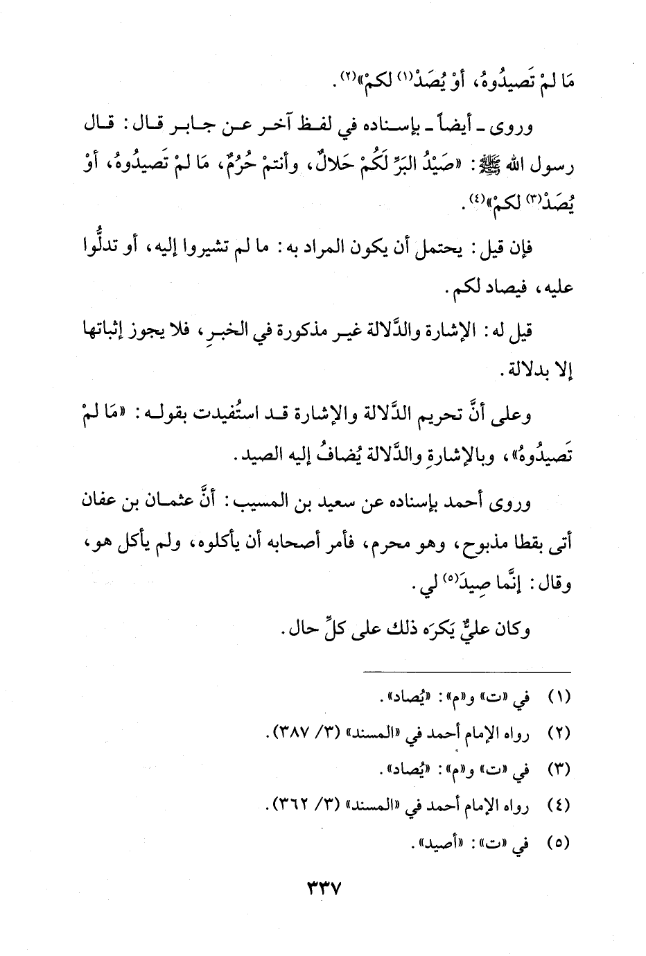 وروى أحمد بإسناده عن سعيد بن المسيب: أن عثمان بن عفان أتى بقطا مذبوح، وهو محرم، فأمر أصحابه أن يأكلوه، ولم يأكل هو، وقال: إنما صيد لي.