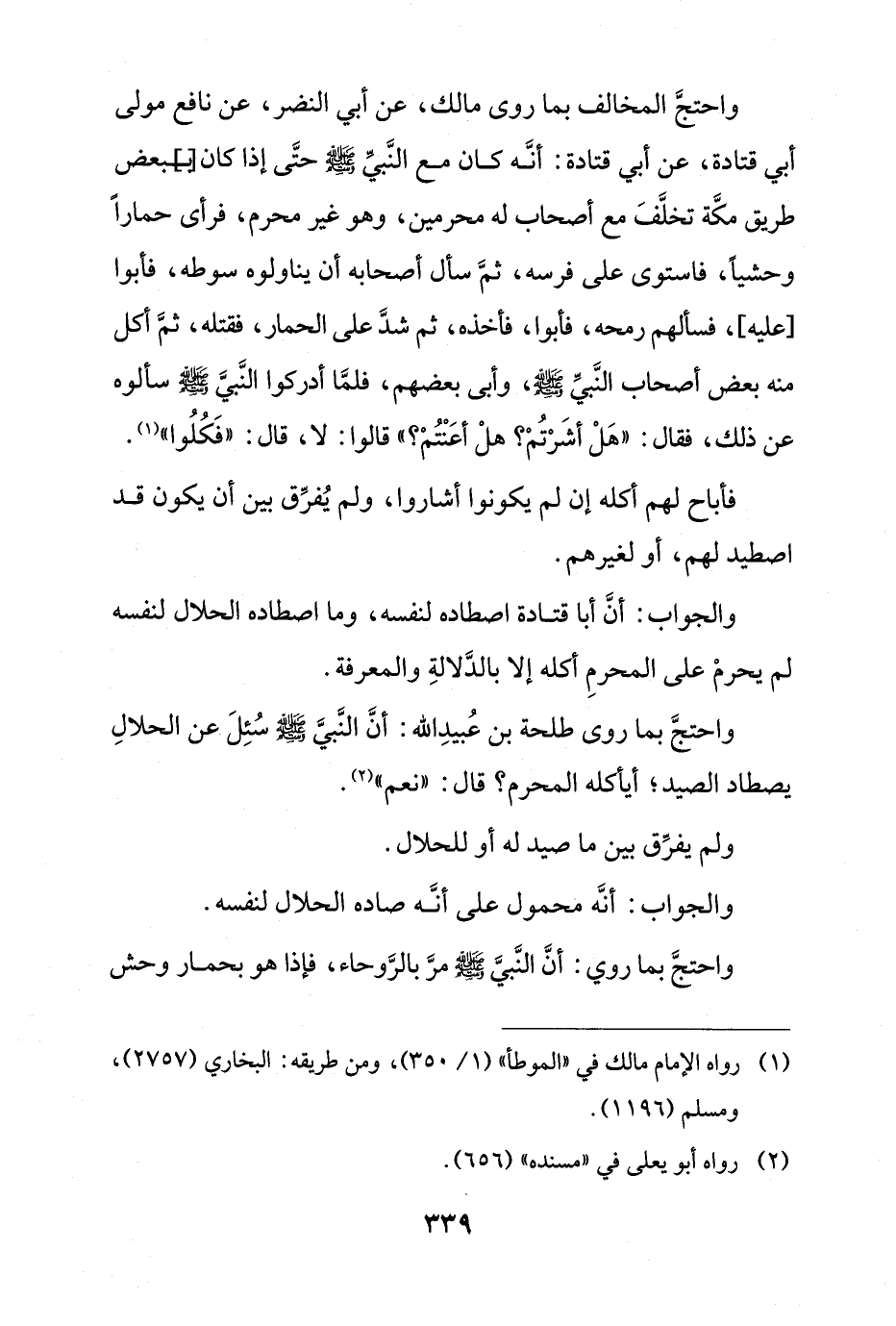واحتج المخالف بما روى مالك، عن أبي النضر، عن نافع مولى أبي قتادة، عن أبي قتادة: أنه كان مع النبي صلى الله عليه وسلّم حتى إذا كا ببعض طريق مكة تخلف مع أصحاب له محرمين، وهو غير محرم، فرأى حماراً وحشياً، فاستوى على فرسه، ثم سأل أصحابه أن يناولوه سوطه، فأبوا [عليه]، فسألهم رمحه، فأبوا، فأخذه، ثم شد على الحمار، فقتله، ثم أكل منه بعض أصحاب النبي صلى الله عليه وسلّم، وأبى بعضهم، فلما أدركوا النبي صلى الله عليه وسلّم سألوه عن ذلك، فقال: "هل أشرتم؟ هل أعنتم؟ " قالوا: لا، قال: "فكلوا".