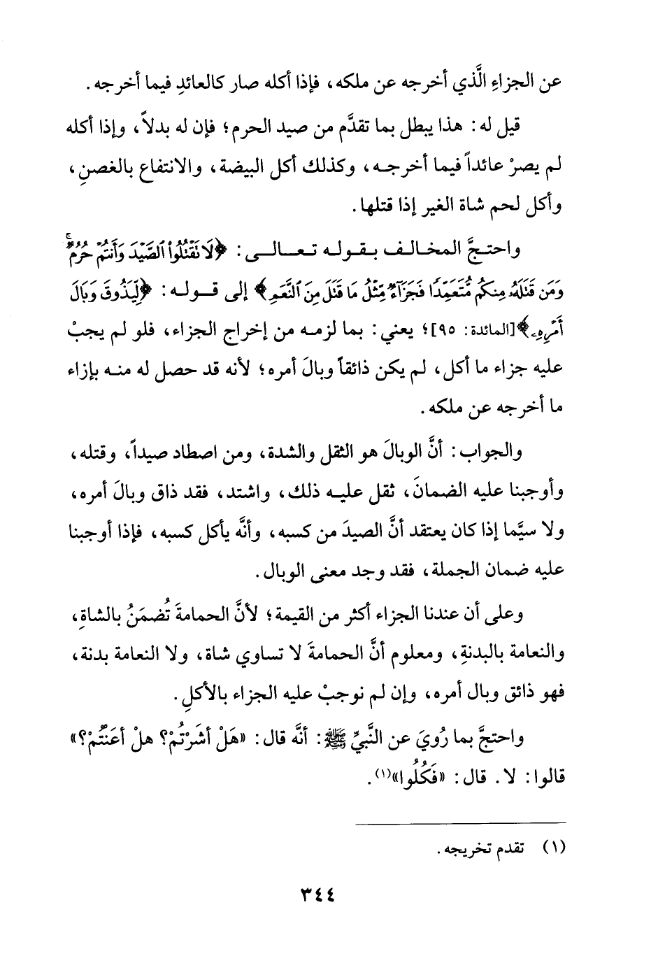 واحتج المخالف بقوله تعالى: {لَا تَقْتُلُوا الصَّيْدَ وَأَنتُمْ حُرُمٌ وَمَن قَتَلَهُ مِنكُم مُّتَعَمِّدًا فَجَزَاءٌ مِّثْلُ مَا قَتَلَ مِنَ النَّعَمِ} إلى قوله: {لِّيَذُوقَ وَبَالَ أَمْرِهِي} [المائدة: 95]؛ يعني: بما لزمه من إخراج الجزاء، فلو لم يجب عليه جزاء ما أكل، لم يكن ذائقاً وبال أمره؛ لأنه قد حصل له منه بإزاء ما أخرجه عن ملكه.