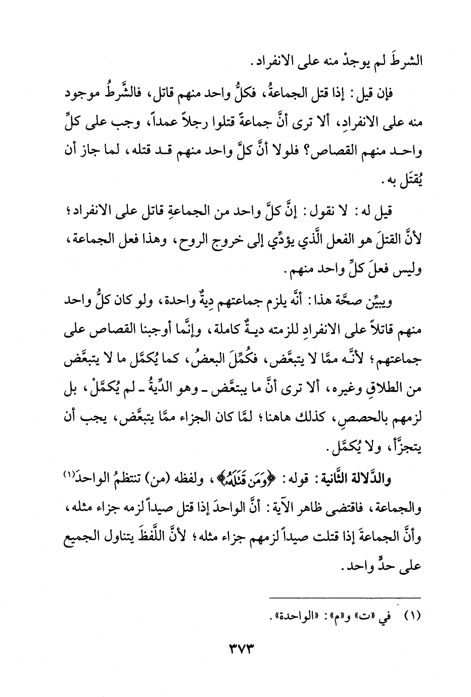 والدلالة الثانية: قوله: {وَمَن قَتَلَهُ}، ولفظه (من) تنتظم الواحد والجماعة، فاقتضى ظاهر الآية: أن الواحد إذا قتل صيداً لزمه جزاء مثله، وأن الجماعة إذا قتلت صيداً لزمهم جزاء مثله؛ لأن اللفظ يتناول الجميع على حد واحد.