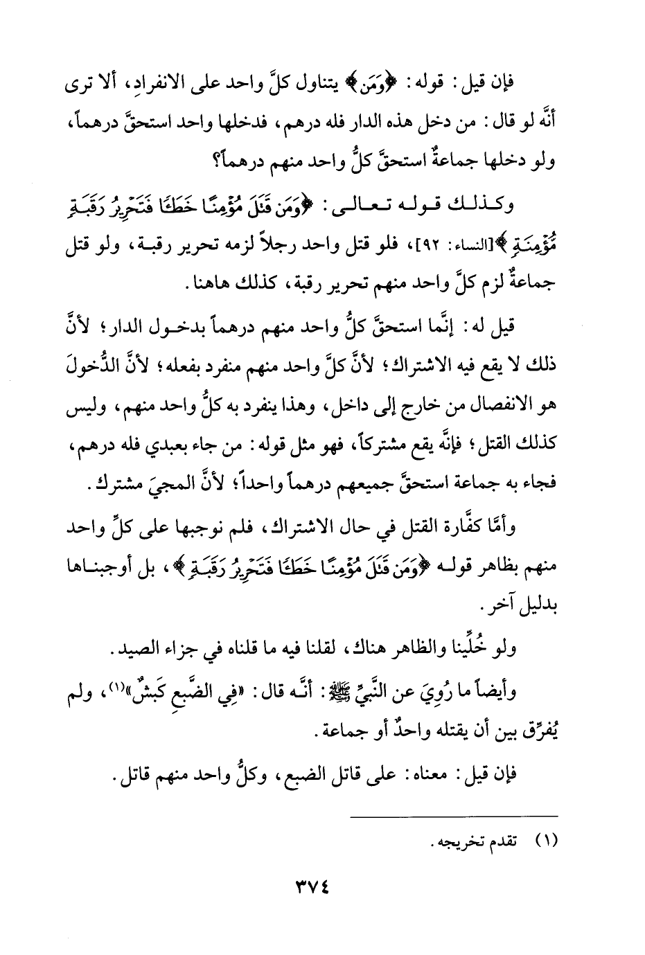 وأما كفارة القتل في حال الاشتراك، فلم نوجبها على كل واحد منهم بظاهر قوله {وَمَن قَتَلَ مُؤْمِنًا خَطَئًا فَتَحْرِيرُ رَقَبَةٍ}، بل أوجبناها بدليل آخر.