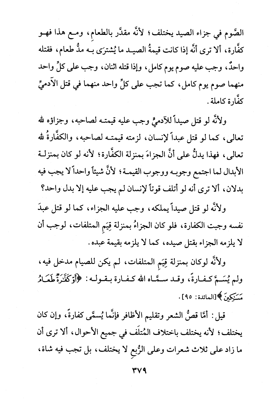 ولأنه لو قتل صيداً يملكه، وجب عليه الجزاء، كما لو قتل عبد نفسه وجبت الكفارة، فلو كان الجزاء بمنزلة قيم المتلفات، لوجب أن لا يلزمه الجزاء بقتل صيده، كما لا يلزمه بقيمة عبده.