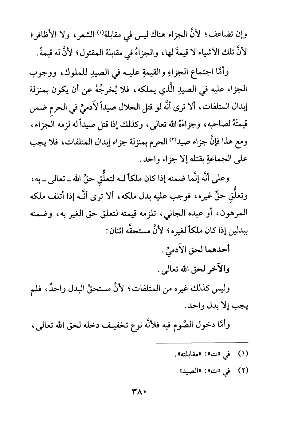وأما اجتماع الجزاء والقيمة عليه في الصيد للملوك، ووجوب الجزاء عليه في الصيد الذي يملكه، فلا يُخرجه عن أن يكون بمنزلة إبدال المتلفات، ألا ترى أنه لو قتل الحلال صيداً لآدمي في الحرم ضمن قيمته لصاحبه، وجزاءه الله تعالى، وكذلك إذا قتل صيداً له لزمه الجزاء، ومع هذا فإن جزاء صيد الحرم بمنزلة جزاء إبدال المتلفات، فلا يجب على الجماعة بقتله إلا جزاء واحد.