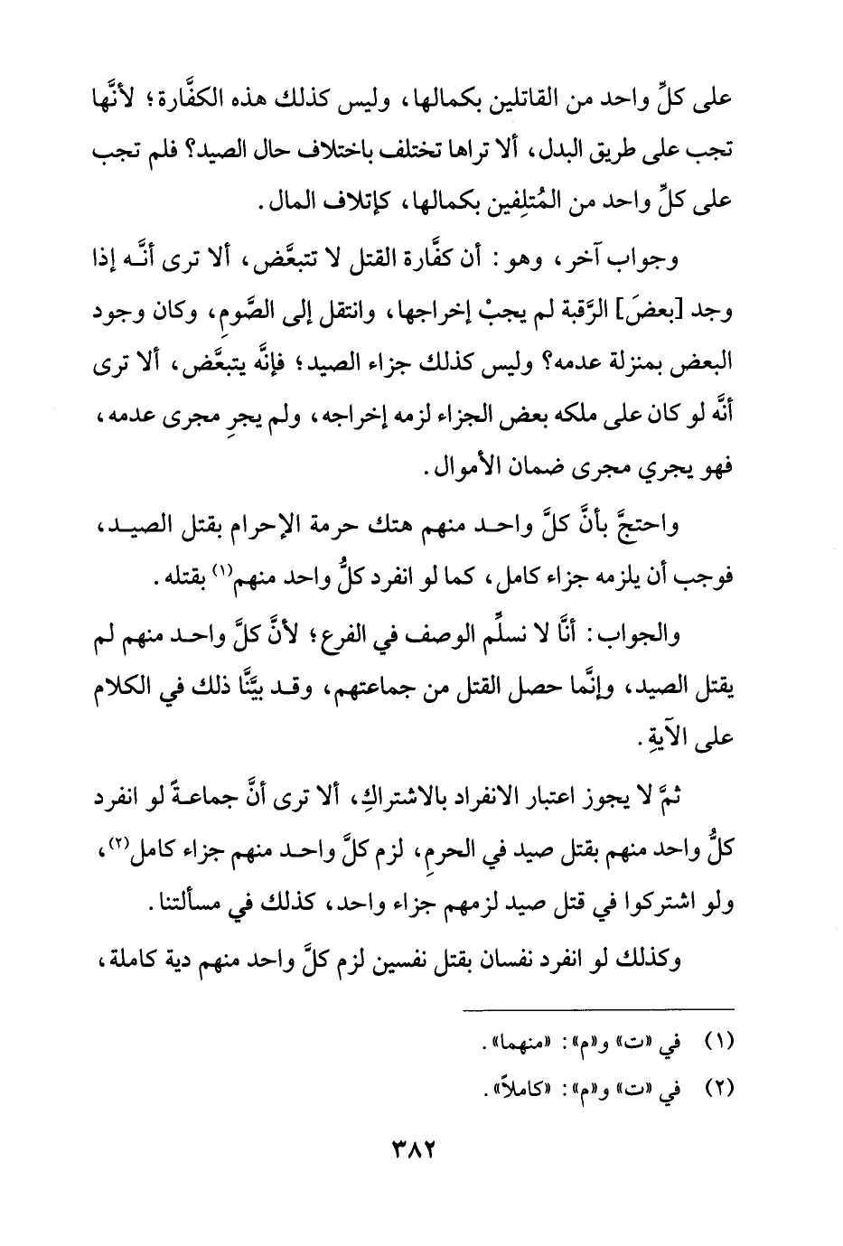 والجواب: أنا لا نسلم الوصف في الفرع؛ لأن كل واحد منهم لم يقتل الصيد، وإنما حصل القتل من جماعتهم، وقد بينا ذلك في الكلام على الآية.
