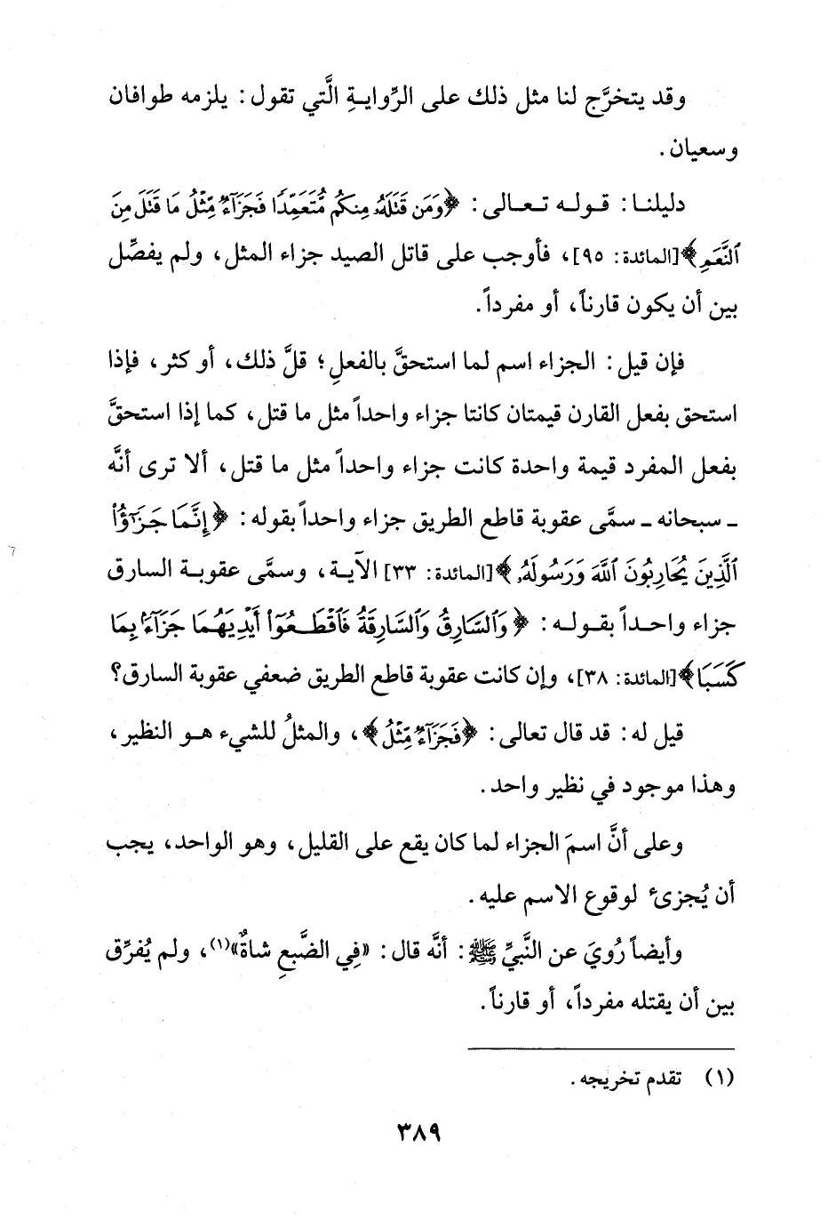 فإن قيل: الجزاء اسم لما استحق الفعل؛ قل ذلك، أو كثر، فإذا استحق بفعل القارن قيمتان كانتا جزاء واحداً مثل ما قتل، كما إذا استحق بفعل المفرد قيمة واحدة كانت جزاء واحداً مثل ما قتل، ألا ترى أنه -سبحانه- سمى عقوبة قاطع الطريق جزاء واحداً بقوله: {إِنَّمَا جَزَاؤُا الَّذِينَ يُحَارِبُونَ اللَّهَ وَرَسُولَهُ} [المائدة: 33] الآية، وسمى عقوبة السارق جزاء واحداً بقوله: {وَالسَّارِقُ وَالسَّارِقَةُ فَاقْطَعُوا أَيْدِيَهُمَا جَزَاءً بِمَا كَسَبَا} [المائدة: 38]، وإن كانت عقوبة قاطع الطريق ضعفي عقوبة السارق؟