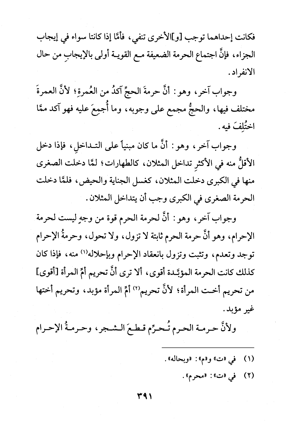 وجواب آخر، وهو: أن حرمة الحج آكد من العمرة؛ لأن العمرة مختلف فيها، والحج مجمع على وجوبه، وما أُجمع عليه فهو آكد مما اختلف فيه.