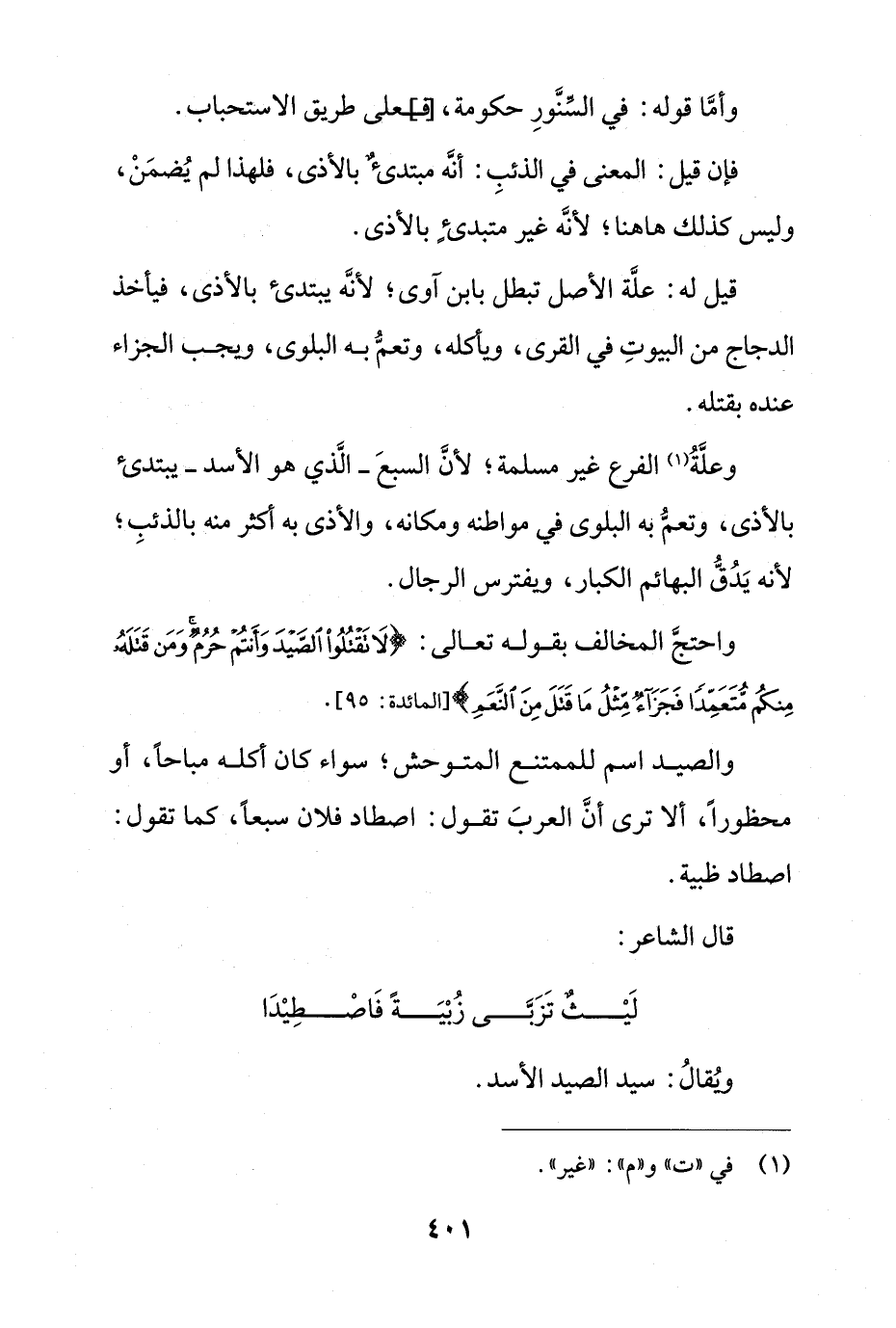 وعلة الفرع غير مسلمة؛ لأن السبع -الذي هو الأسد- يبتدئ بالأذى، وتعم به البلوى في مواطنه ومكانه، والأذى به أكثر منه بالذئب؛ لأنه يدق البهائم الكبار، ويفترس الرجال.