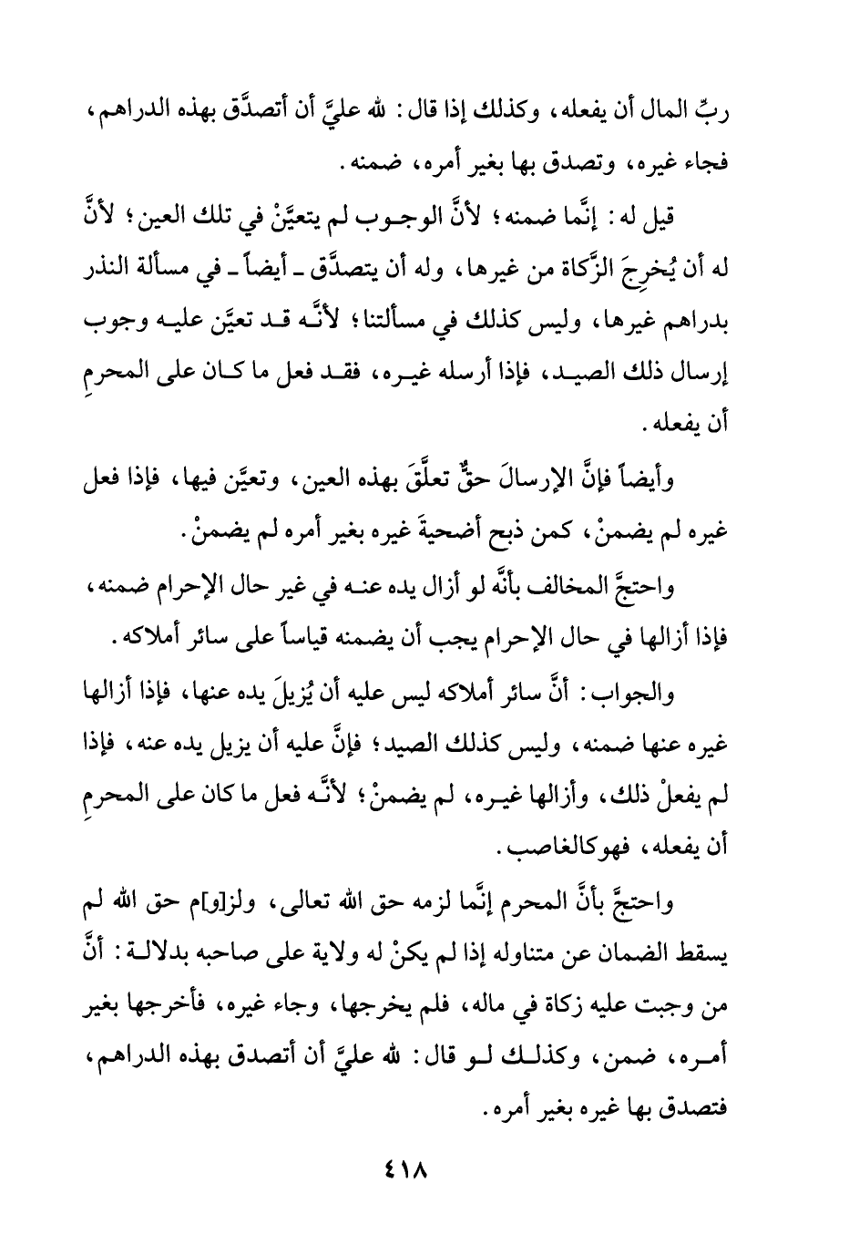 قيل له: إنما ضمنه؛ لأن الوجوب لم يتعين في تلك العين؛ لأن له أن يخرج الزكاة من غيرها، وله أن يتصدق -أيضاً- في مسألة النذر بدراهم غيرها، وليس كذلك في مسألتنا؛ لأنه قد تعين عليه وجوب إرسال ذلك الصيد، فإذا أرسله غيره، فقد فعل ما كان على المحرم أن يفعله.