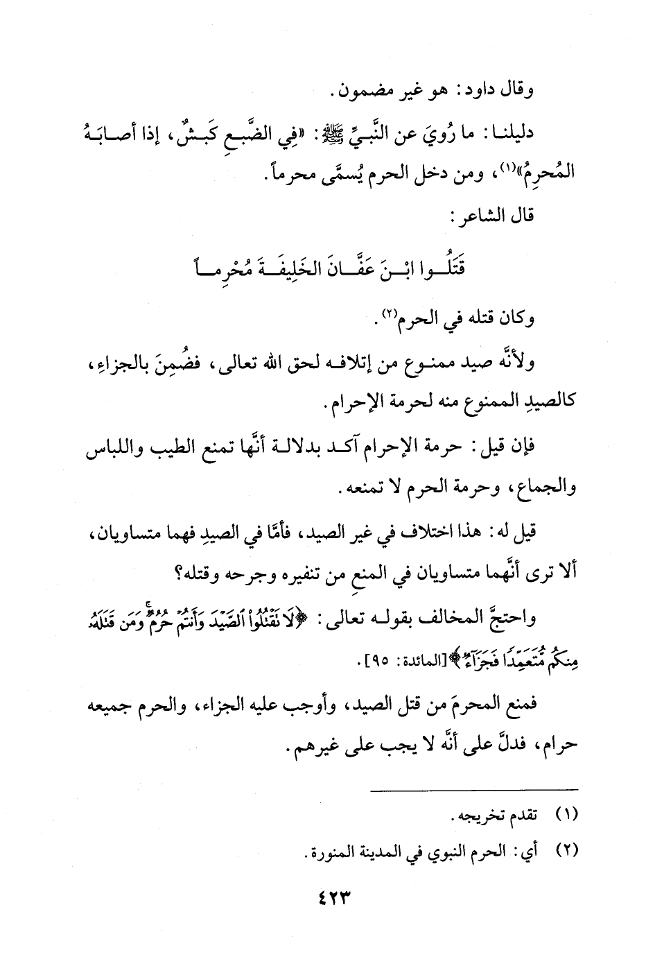 واحتج المخالف بقوله تعالى: {لَا تَقْتُلُوا الصَّيْدَ وَأَنتُمْ حُرُمٌ وَمَن قَتَلَهُ مِنكُم مُّتَعَمِّدًا فَجَزَاءٌ} [المائدة: 95].