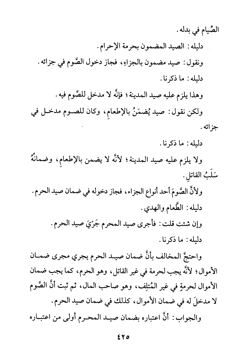 واحتج المخالف بأن ضمان صيد الحرم يجري مجرى ضمان الأموال؛ لأنه يجب لحرمة في غير القاتل، وهو الحرم، كما يجب ضمان الأموال لحرمة في غير المتلف، وهو صاحب المال، ثم ثبت أن الصوم لا مدخل له في ضمان الأموال، كذلك في ضمان صيد الحرم.