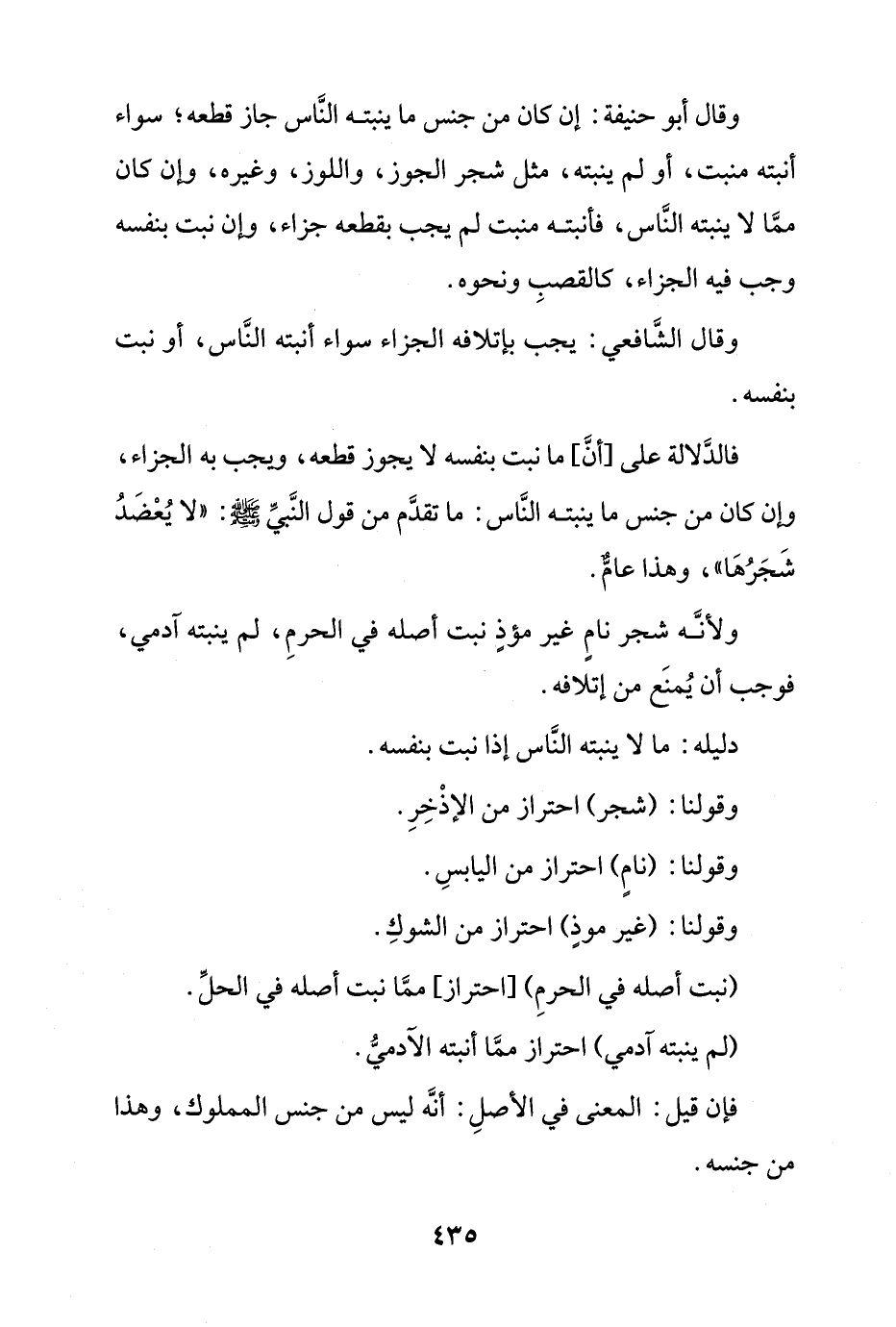 فالدلالة على [أن] ما نبت بنفسه لا يجوز قطعه، ويجب به الجزاء، وإن كان من جنس ما ينبته الناس: ما تقدم من قول النبي صلى الله عليه وسلّم: "لا يُعضد شجرها"، وهذا عام.