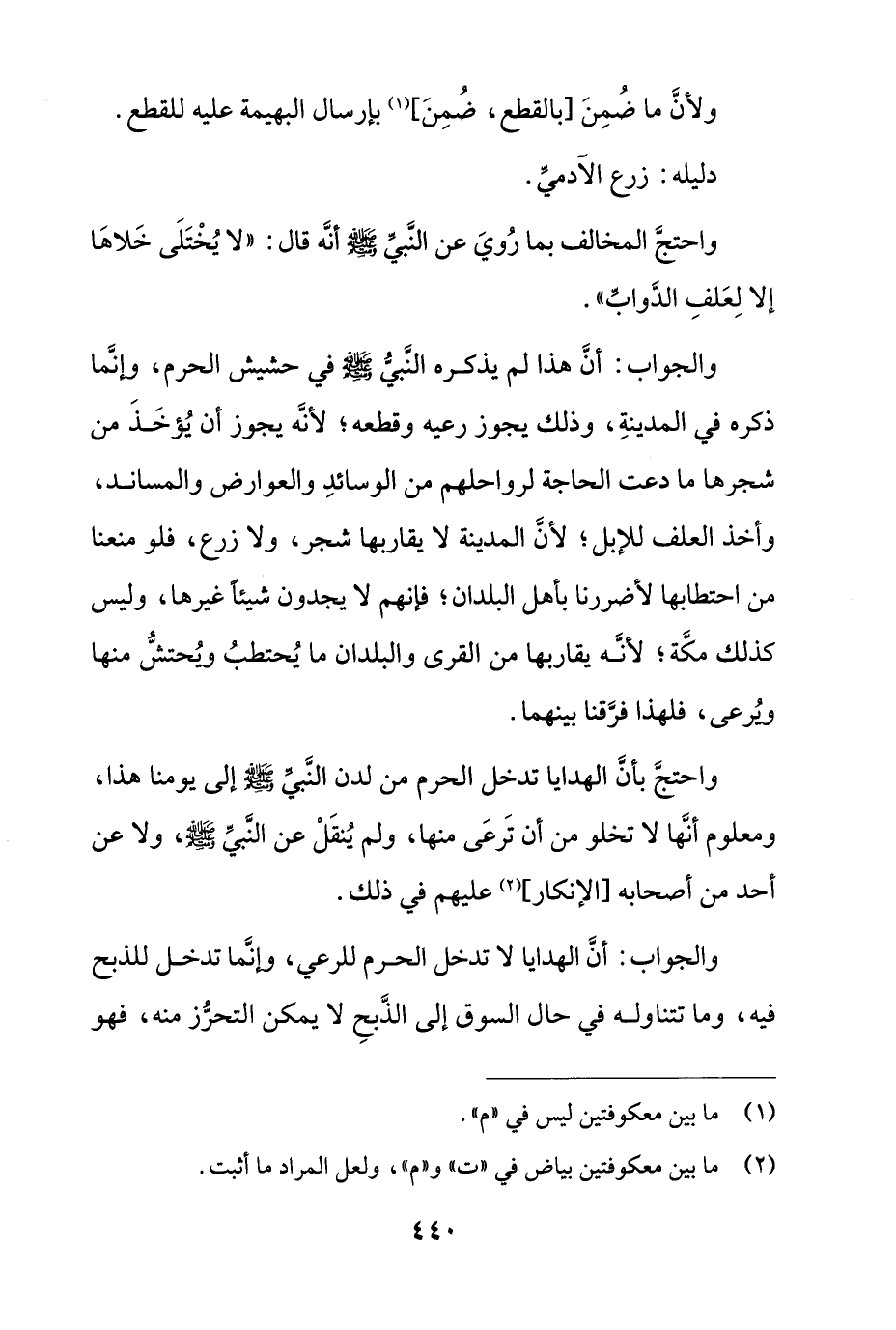 واحتج بأن الهدايا تدخل الحرم من لدن النبي صلى الله عليه وسلّم إلى يومنا هذا، ومعلوم أنها لا تخلو من أن ترعى منها، ولم يُنقل عن النبي صلى الله عليه وسلّم، ولا عن أحد من أصحابه [الإنكار] عليهم في ذلك.