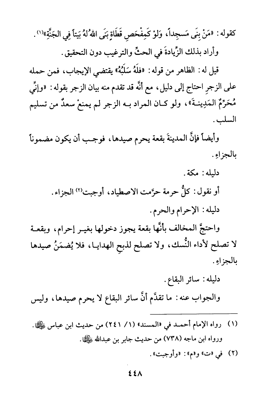 وأيضاً فإن المدينة بقعة يحرم صيدها، فوجب أن يكون مضموناً بالجزاء.