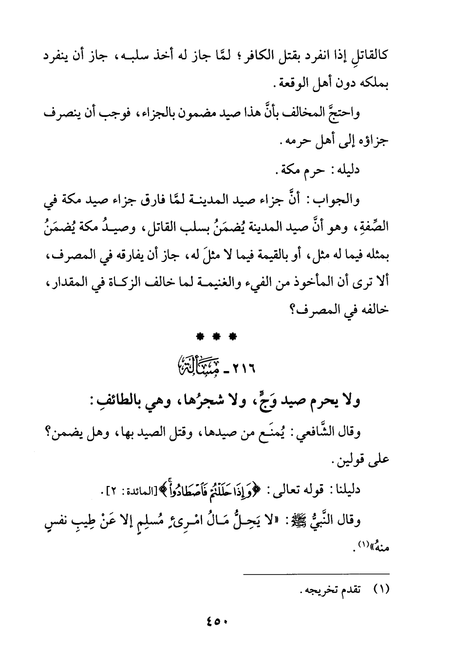 والجواب: أن جزاء صيد المدينة لما فارق جزاء صيد مكة في الصفة، وهو أن صيد المدينة يُضمن بسلب القاتل، وصيد مكة يُضمن بمثله فيما له مثل، أو بالقيمة فيما لا مثل له، جاز أن يفارقه في المصرف، ألا ترى أن المأخوذ من الفئ والغنيمة لما خالف الزكاة في المقدار، خالفه في المصرف؟