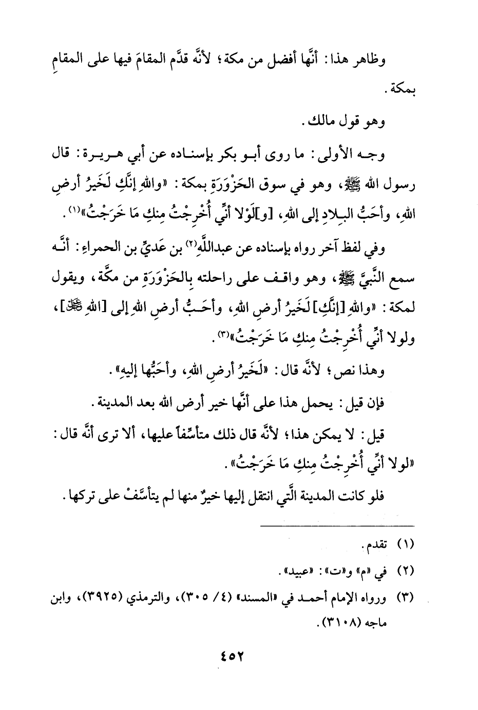 وفي لفظ آخر رواه بإسناده عن عبد الله بن عدي بن الحمراء: أنه سمع النبي صلى الله عليه وسلّم، وهو واقف على راحلته بالحزورة من مكة، ويقول لمكة، "والله [إنك] لخير أرض الله، وأحب أرض الله إلى [الله عز وجل]، ولولا أني أُخرجت منك ما خرجت".