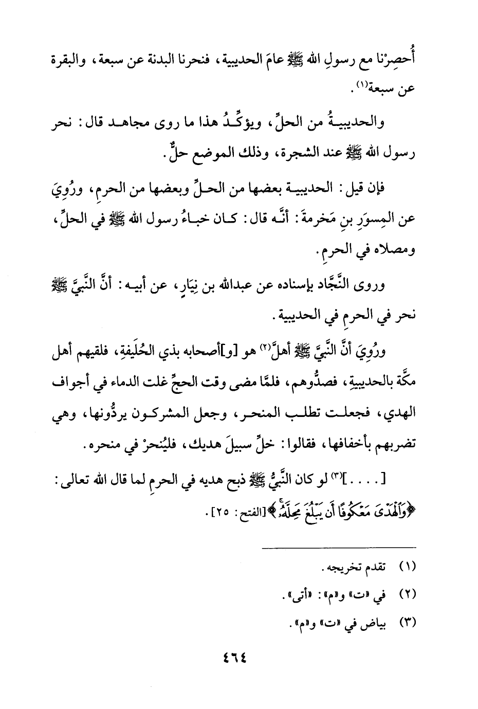 [....] لو كان النبي صلى الله عليه وسلّم ذبح هديه في الحرم لما قال الله تعالى: {وَالْهَدْيَ مَعْكُوفًا أَن يَبْلُغَ مَحِلَّهُ} [الفتح: 25].