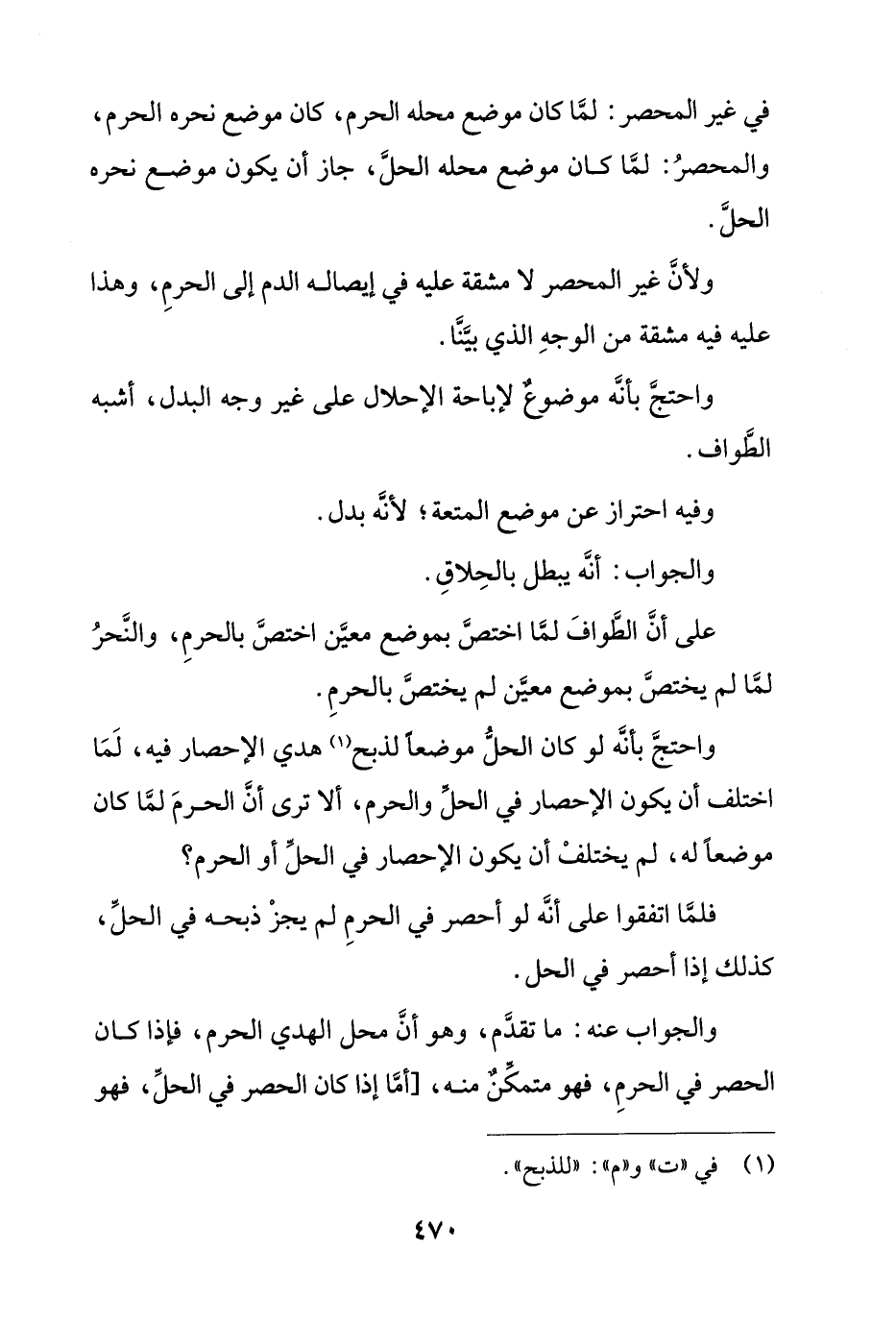 واحتج بأنه لو كان الحل موضعاً لذبح هدي الإحصار فيه، لما اختلف أن يكون الإحصار في الحل والحرم، ألا ترى أن الحرم لما كان موضعاً له، لم يختلف أن يكون الإحصار في الحل أو الحرم؟