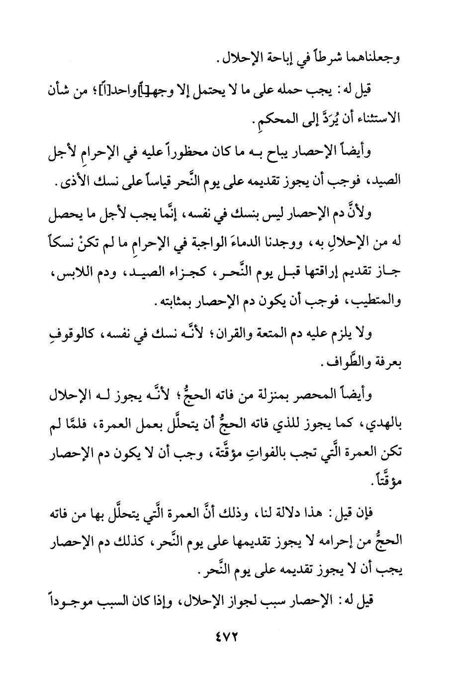 ولأن دم الإحصار ليس بنسك في نفسه، إنما يجب لأجل ما يحصل له من الإحلال به، ووجدنا الدماء الواجبة في الإحرام ما لم تكن نسكاً جاز تقديم إراقتها قبل يوم النحر، كجزاء الصيد، ودم اللابس، والمتطيب، فوجب أن يكون دم الإحصار بمثابته.