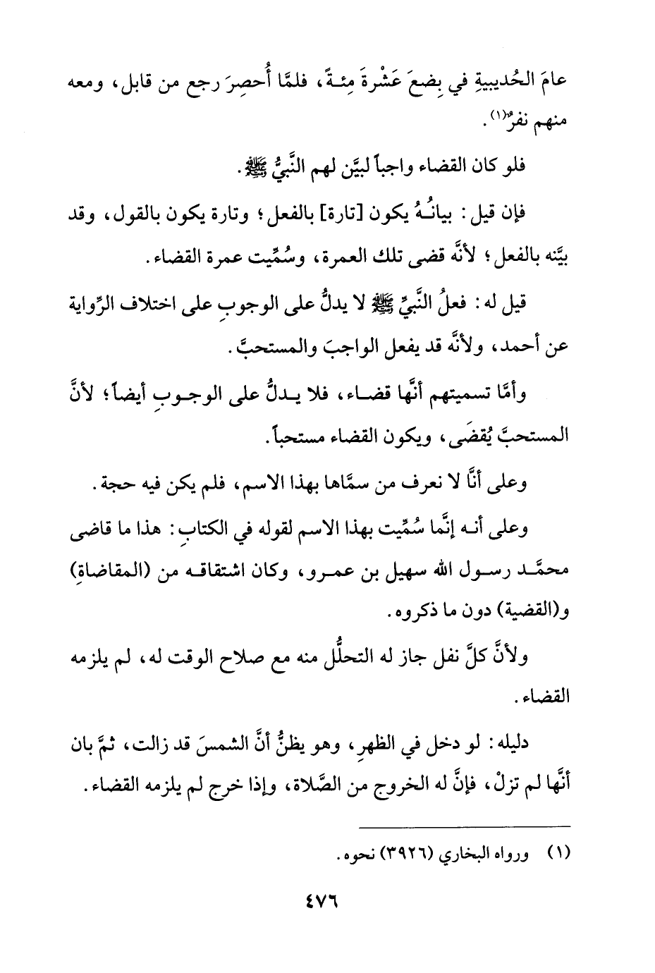 فإن قيل: بيانه يكون [تارة] بالفعل؛ وتارة يكون بالقول، وقد بينه بالفعل؛ لأنه قضى تلك العمرة، وسُميت عمرة القضاء.