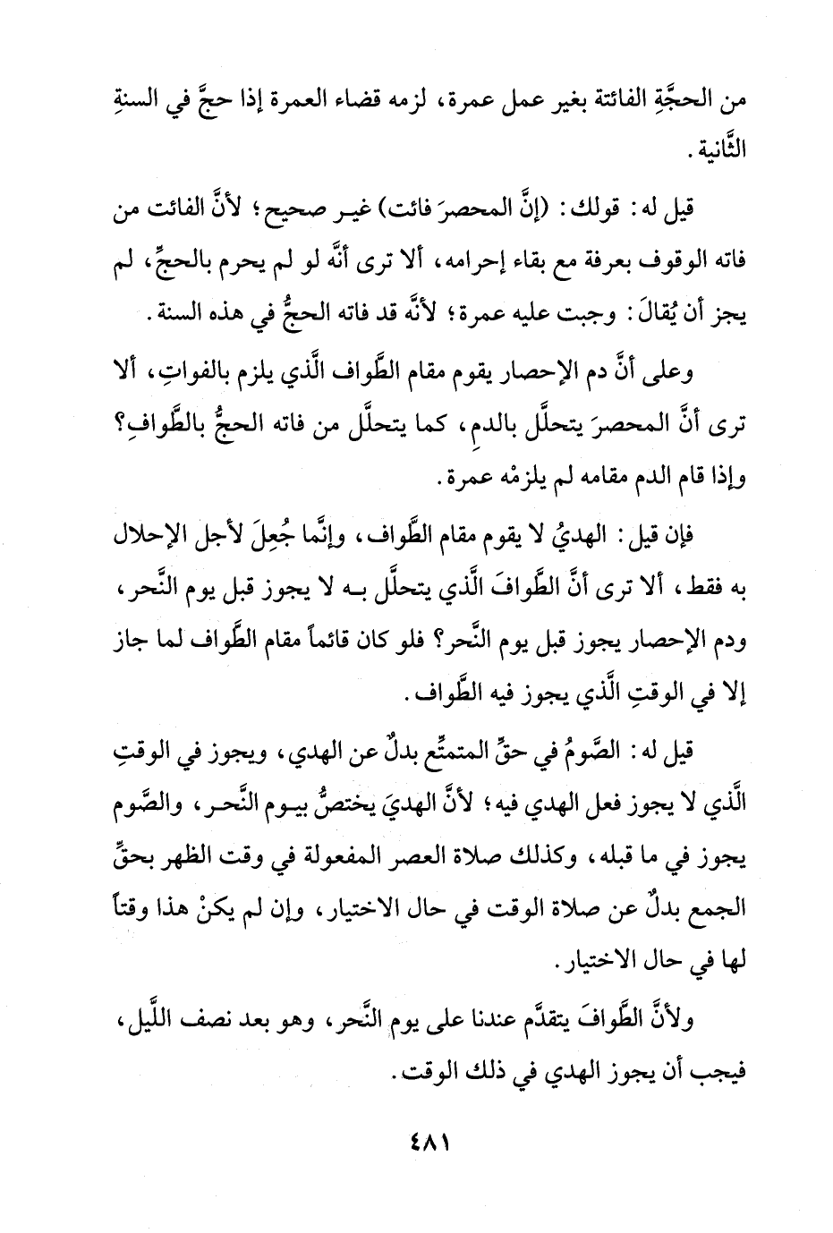 وعلى أن دم الإحصار يقوم مقام الطواف الذي يلزم بالفوات، ألا ترى أن المحصر يتحلل بالدم، كما يتحلل من فاته الحج بالطواف؟ وإذا قام الدم مقامه لم يلزمه عمرة.