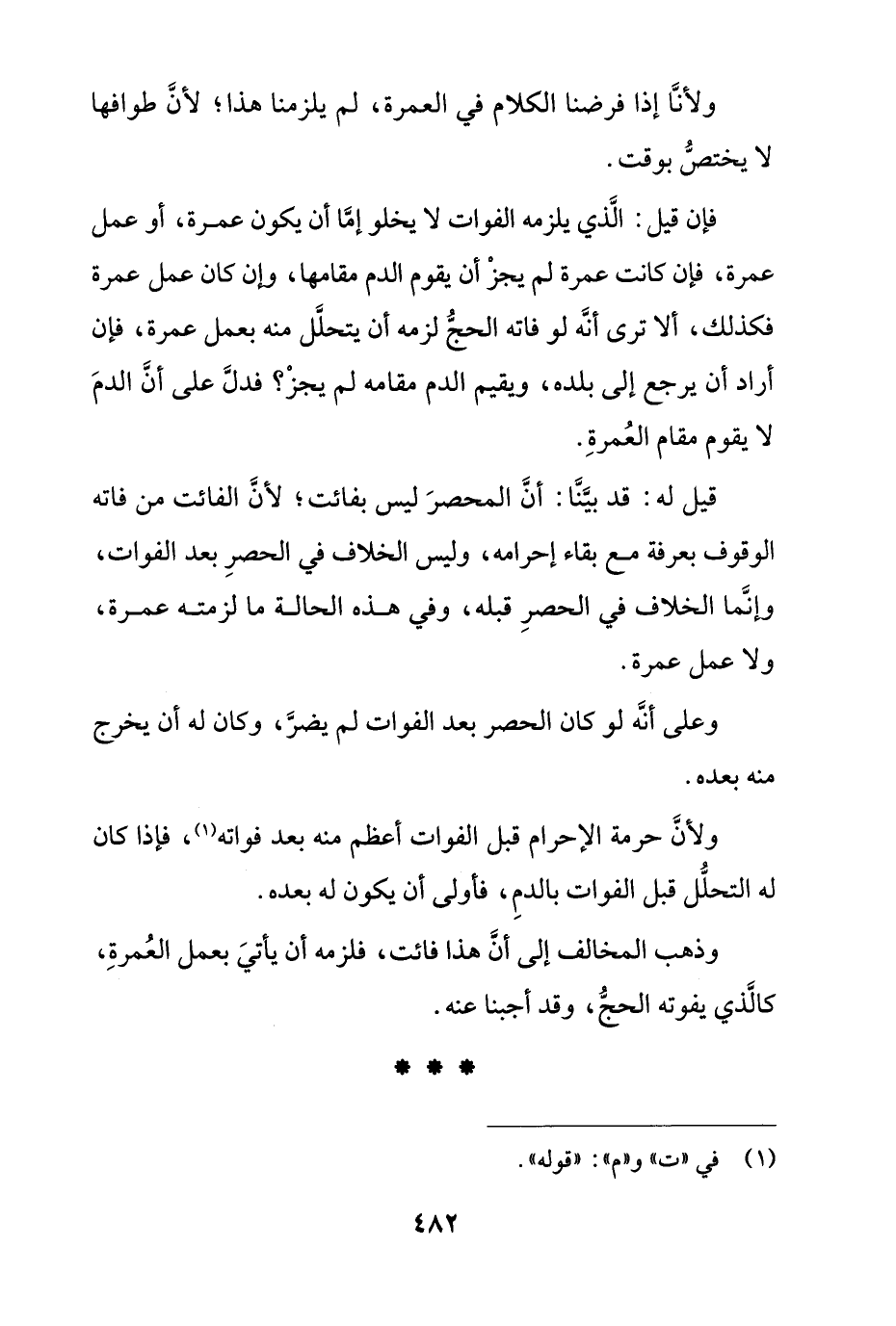 وذهب المخالف إلى أن هذا فائت، فلزمه أن يأتي بعمل العمرة، كالذي يفوته الحج، وقد أجبنا عنه.