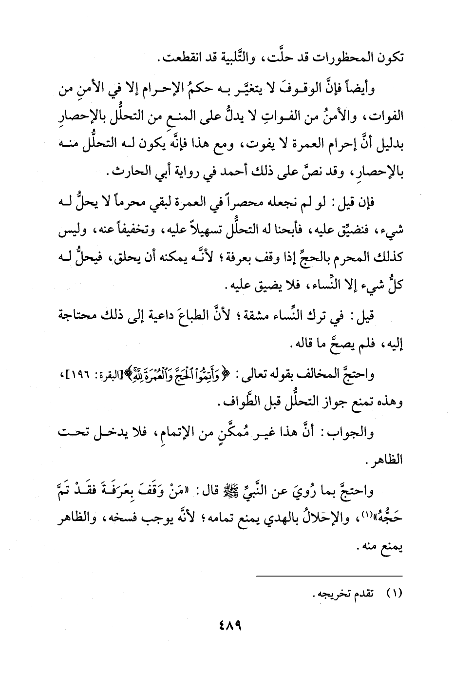 وأيضاً فإن الوقوف لا يتغير به حكم الإحرام إلا في الأمن من الفوات، والأمن من الفوات لا يدل على المنع من التحلل بالإحصار بدليل أن إحرام العمرة لا يفوت، ومع هذا فإنه يكون له التحلل منه بالإحصار، وقد نص على ذلك أحمد في رواية أبي الحارث.