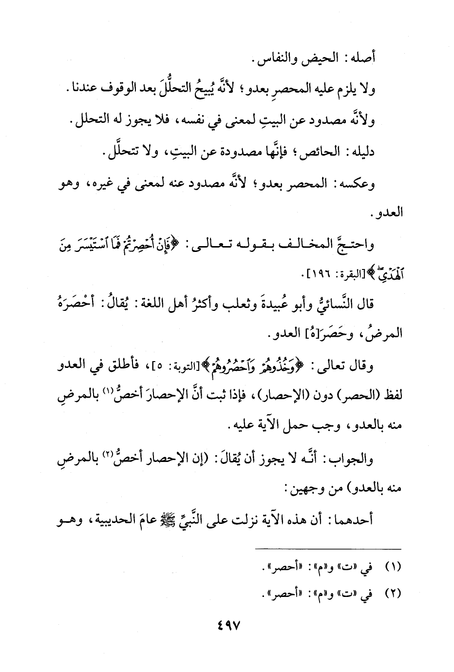 وقال تعالى: {وَخُذُوهُمْ وَاحْصُرُوهُمْ} [التوبة: 5]، فأطلق في العدو لفظ (الحصر) دون (الإحصار)، فإذا ثبت أن الإحصار أخص بالمرض منه بالعدو، وجب حمل الآية عليه.