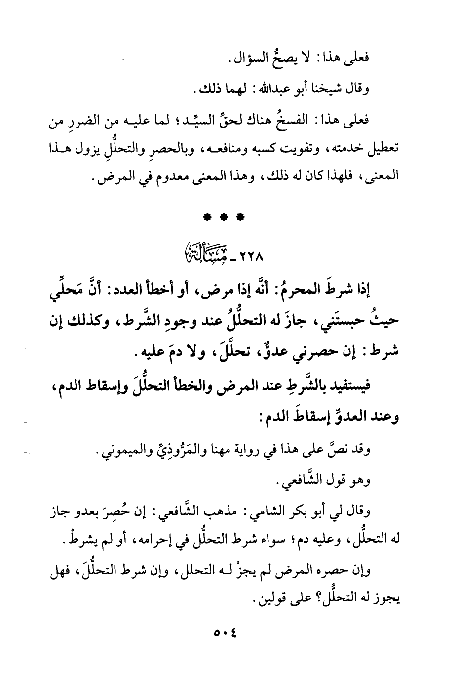 وقال لي أبو بكر الشامي: مذهب الشافعي: إن حُصر بعدو جاز له التحلل، وعليه دم؛ سواء شرط التحلل في إحرامه، أو لم يشرط.