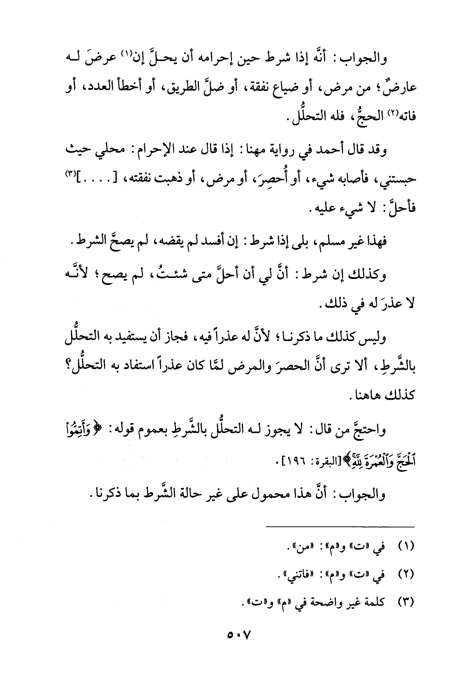 وقد قال أحمد في رواية مهنا: إذا قال عند الإحرام: محلى حيث حبستني، فأصابه شيء، أو أُحصر، أو مرض، أو ذهبت نفقته، [....] فأحل: لا شيء عليه.