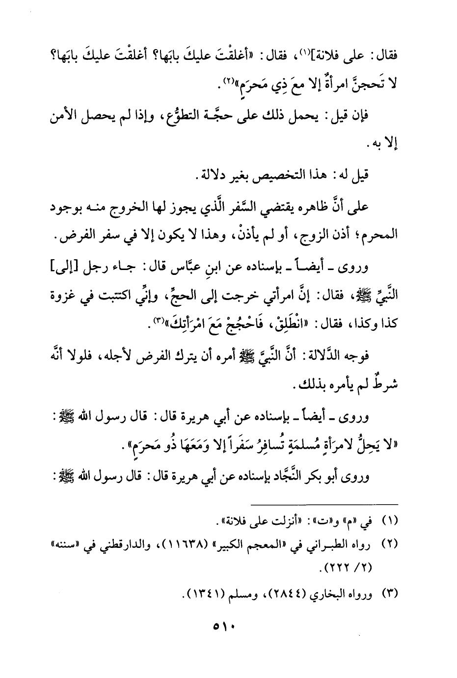 وروى -أيضاً- بإسناده عن أبي هريرة قال: قال رسول الله صلى الله عليه وسلّم: "لا يحل لامرأة مُسلمة تُسافر سفراً إلا ومعها ذو محرم".