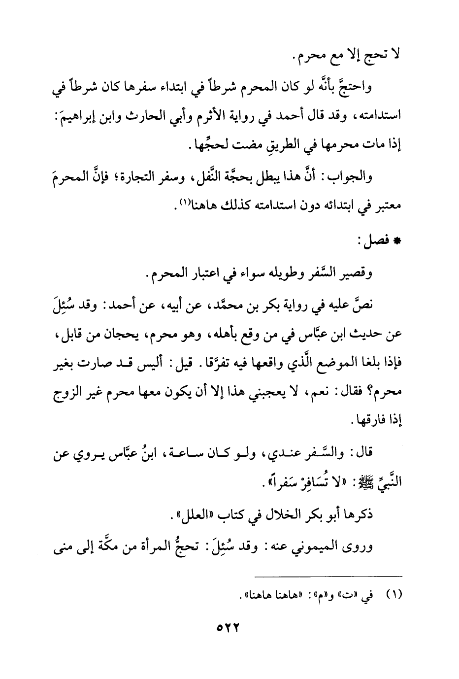 واحتج بأنه لو كان المحرم شرطاً في ابتداء سفرها كان شرطاً في استدامته، وقد قال أحمد في رواية الأثرم وأبي الحارث وابن إبراهيم: إذا مات محرمها في الطريق مضت لحجها.