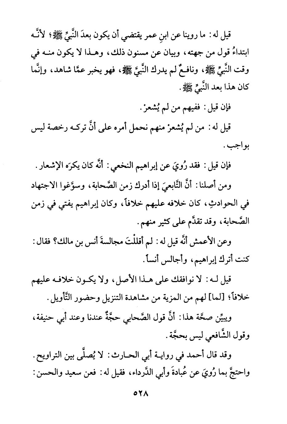 قيل له: ما روينا عن ابن عمر يقتضي أن يكون بعد النبي صلى الله عليه وسلّم؛ لأنه ابتداء قول من جهته، وبيان عن مسنون ذلك، وهذا لا يكون منه في وقت النبي صلى الله عليه وسلّم، ونافع لم يدرك النبي صلى الله عليه وسلّم، فهو يخبر عما شاهد، وإنما كان هذا بعد النبي صلى الله عليه وسلّم.
