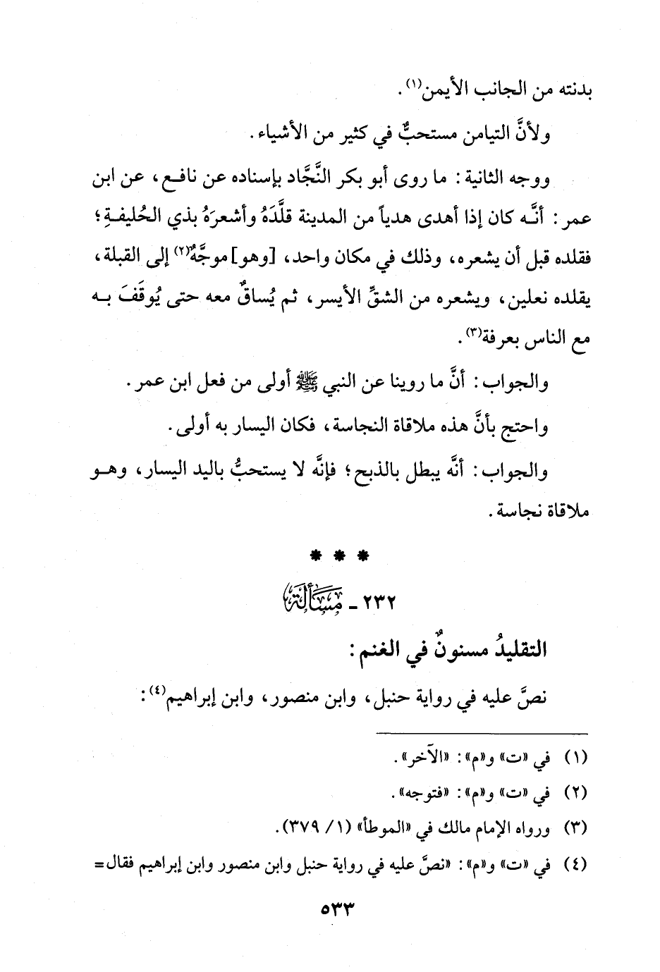 ووجه الثانية: ما روى أبو بكر النجاد بإسناده عن نافع، عن ابن عمر: أنه كان إذا أهدى هدياً من المدينة قلده وأشعره بذي الحليفة؛ فقلده قبل أن يشعره، وذلك في مكان واحد، [وهو] موجه إلى القبلة، يقلده نعلين، ويشعره من الشق الأيسر، ثم يُساق معه حتى يُوقف به مع الناس بعرفة.