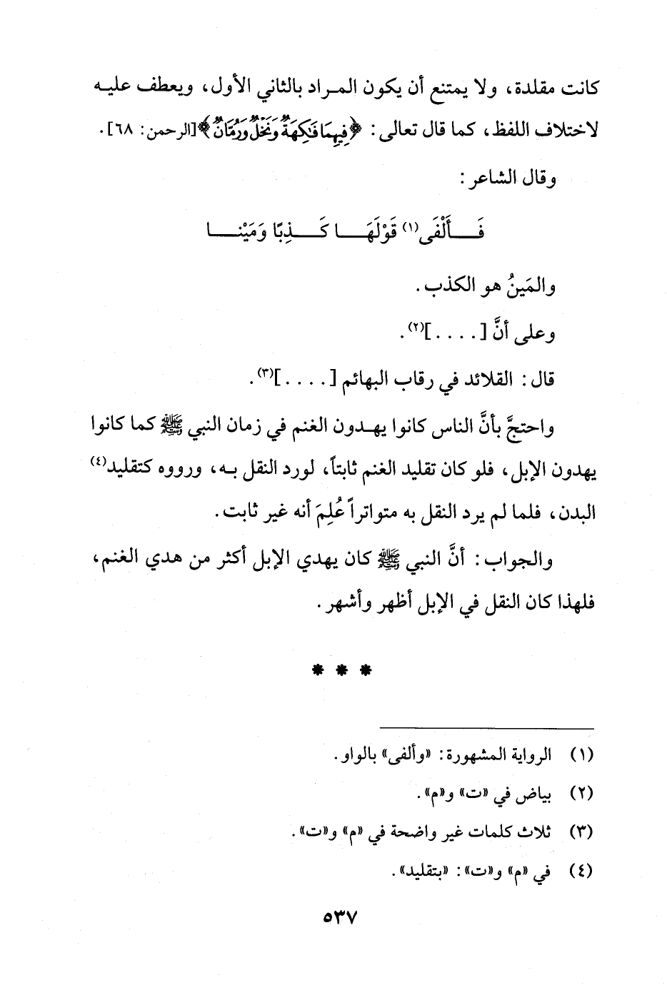 واحتج بأن الناس كانوا يهدون الغنم في زمان النبي صلى الله عليه وسلّمكما كانوا يهدون الإبل، فلو كان تقليد الغنم ثابتاً، لورد النقل به، ورووه كتقليد البدن، فلما لم يرد النقل به متواتراً عُلم أنه غير ثابت.