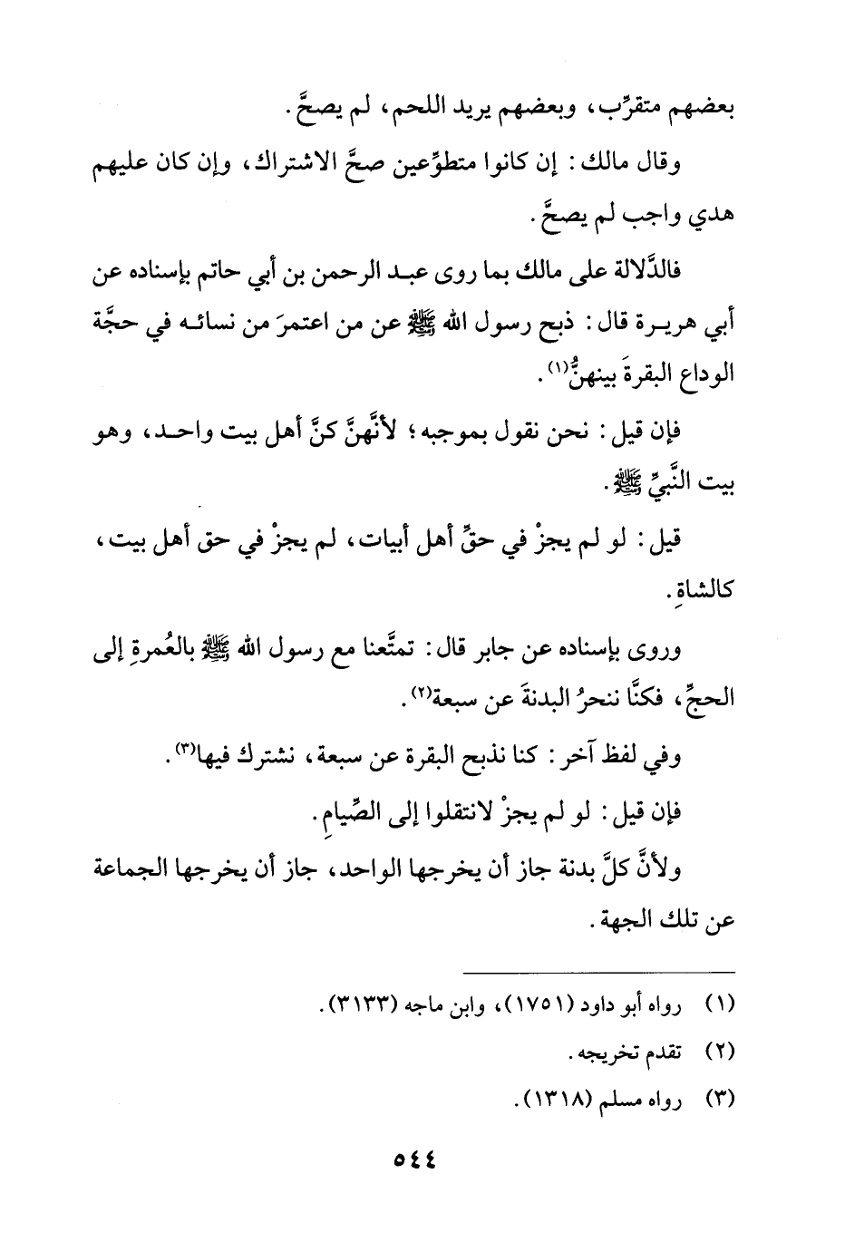 فالدلالة على مالك بما روى عبد الرحمن بن أبي حاتم بإسناده عن أبي هريرة قال: ذبح رسول الله صلى الله عليه وسلّم عن من اعتمر من نسائه في حجة الوداع البقرة بينهن.