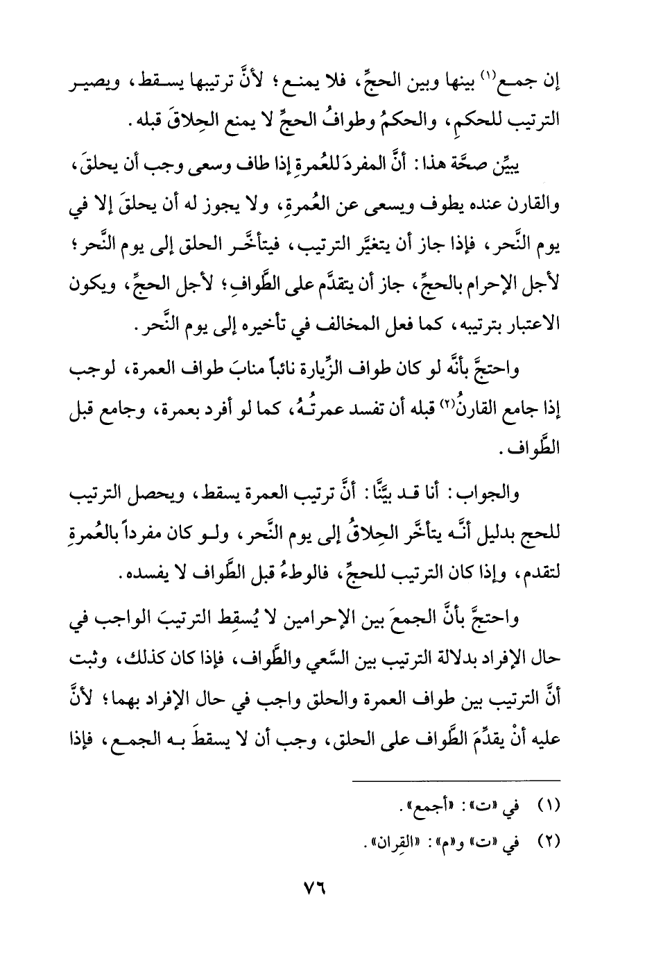 واحتج بأن الجمع بين الإحرامين لا يسقط الترتيب الواجب في حال الإفراد بدلالة الترتيب بين السعي والطواف، فإذا كان كذلك، وثبت أن الترتيب بين طواف العمرة والحلق واجب في حال الإفراد بهما؛ لأن عليه أن يقدم الطواف على الحلق، وجب أن لا يسقط به الجمع، فإذا