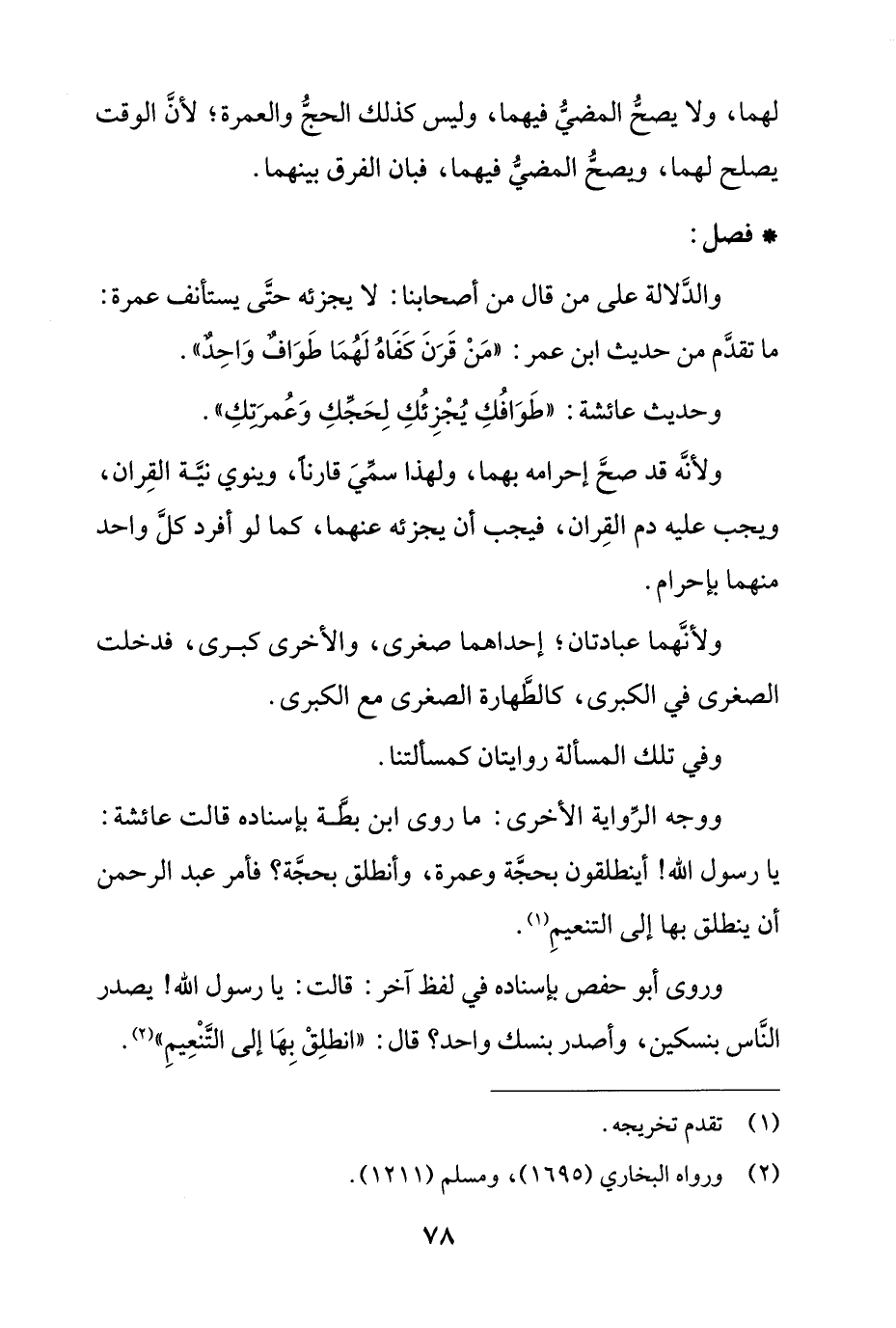 وروى أبو حفص بإسناده في لفظ آخر: قالت: يا رسول الله! يصدر الناس بنسكين، وأصدر بنسك واحد؟ قال: "انطلق بها إلى التنعيم".