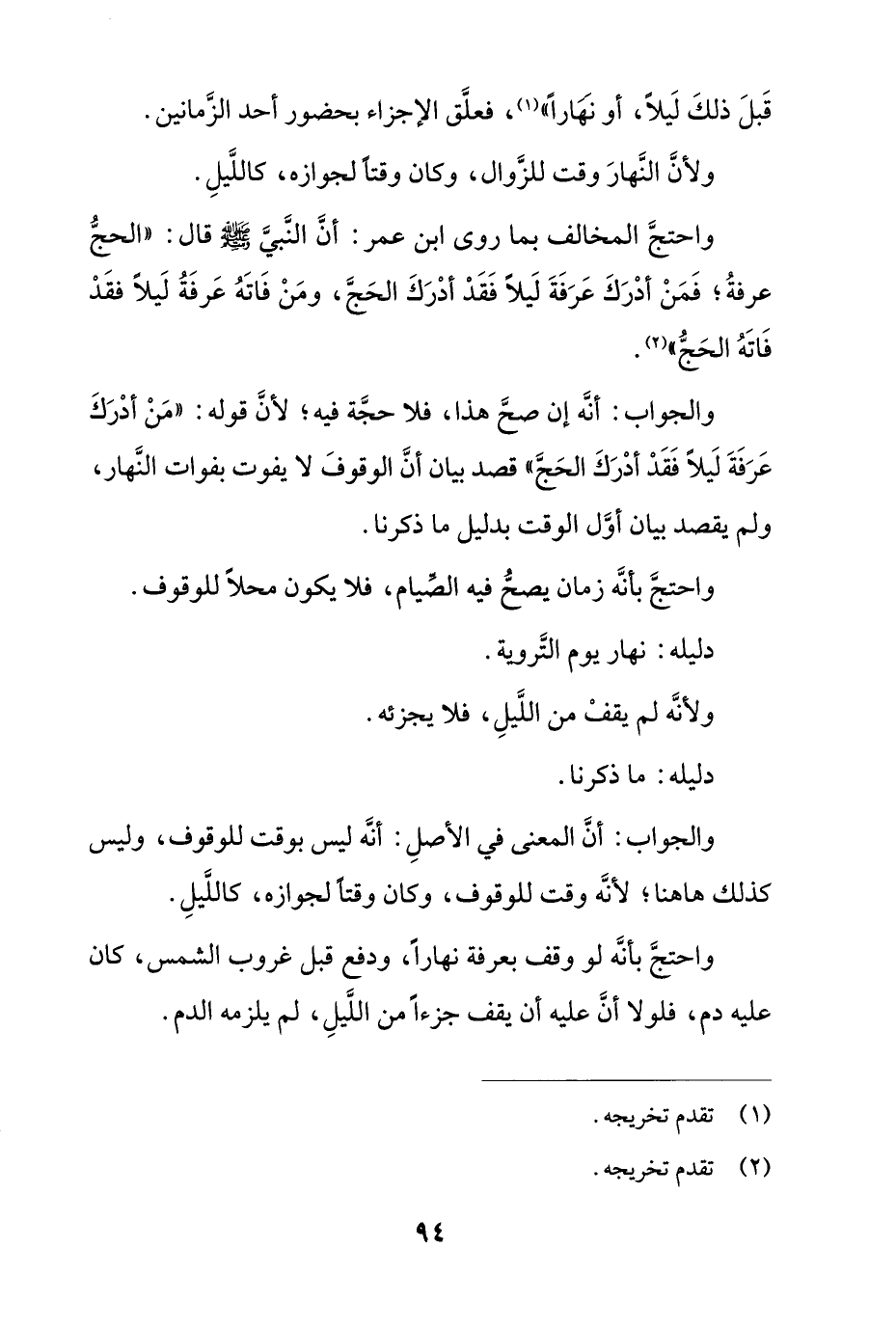 والجواب: أنه إن صح هذا، فلا حجة فيه؛ لأن قوله: "من أدرك عرفة ليلاً فقد أردك الحج" قصد بيان أن الوقوف لا يفوت بفوات النهار، ولم يقصد بيان أول الوقت بدليل ما ذكرنا.