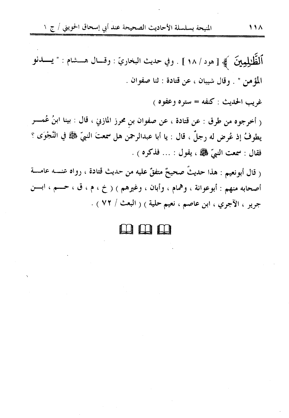 الظَّالِمِينَ} [هود / 18]. وفي حديث البخاريّ: وقال هشام: "يدنو المؤمن". وقال شيبان، عن قتادة: ثنا صفوان.